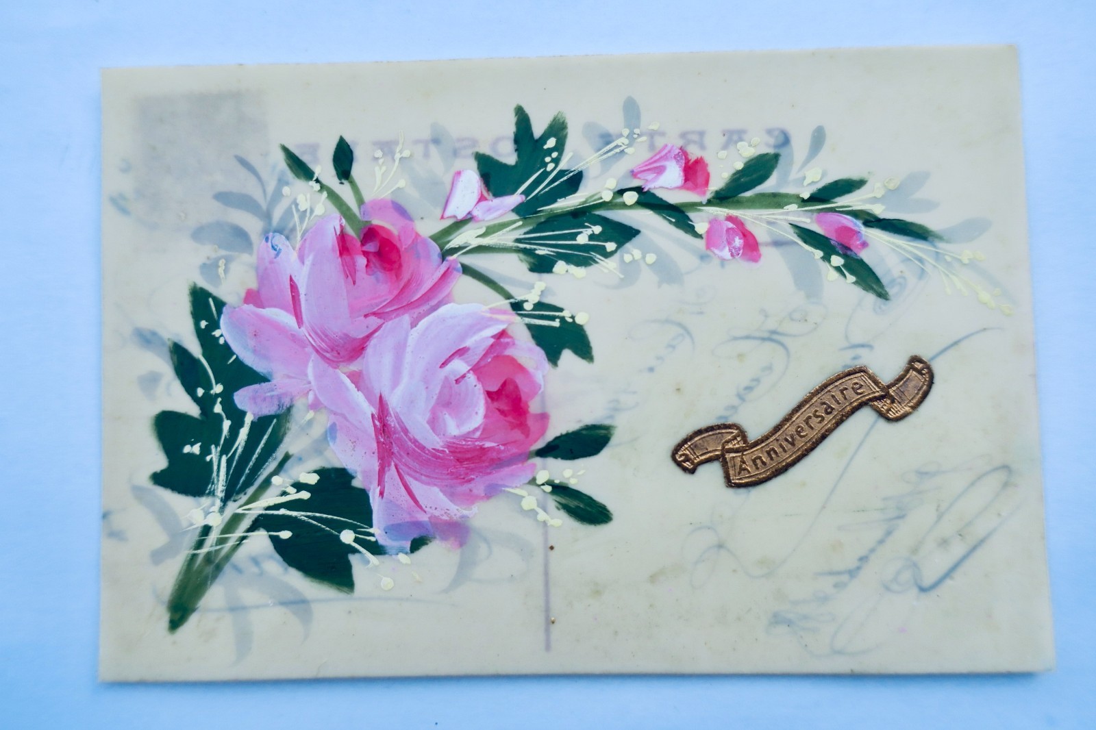 Bonne Fête fleurs brodées à la main. Bonne Fête fleurs brodées à la main 1918. canivet rehaussé en couleur à la main 70 x 110 mm. éventail rehaussé à la peinture 90 x 30 mm. Souvenir d’un coeur ami et dévoué.