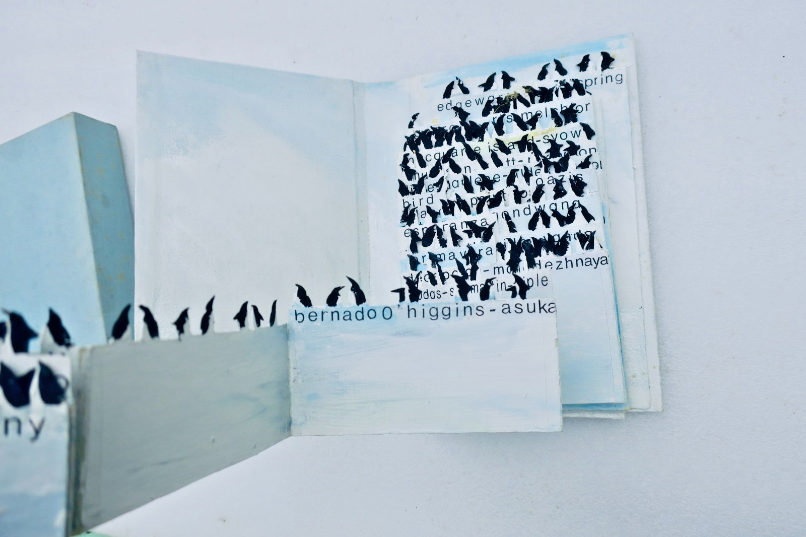 Dans une reliure cartonnée et peinte, (12 x 18 cm), sous étui toilé, une frise dépliante peinte sur 280 cm., orné de plus de 150 pingouins & de noms Edgeworth, David Spring, Gonzalez Videla, Sanae, Georg von Neumayer, Druzhnaya, Rizopatron, astronomo cruls-Belgrano, Yankee Bay, Gonwana…