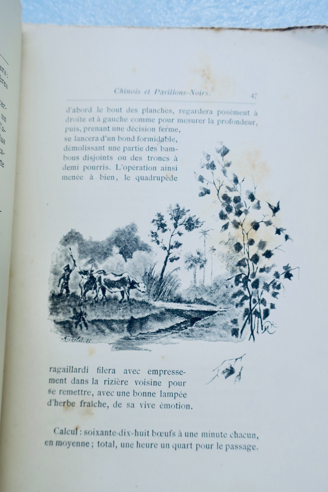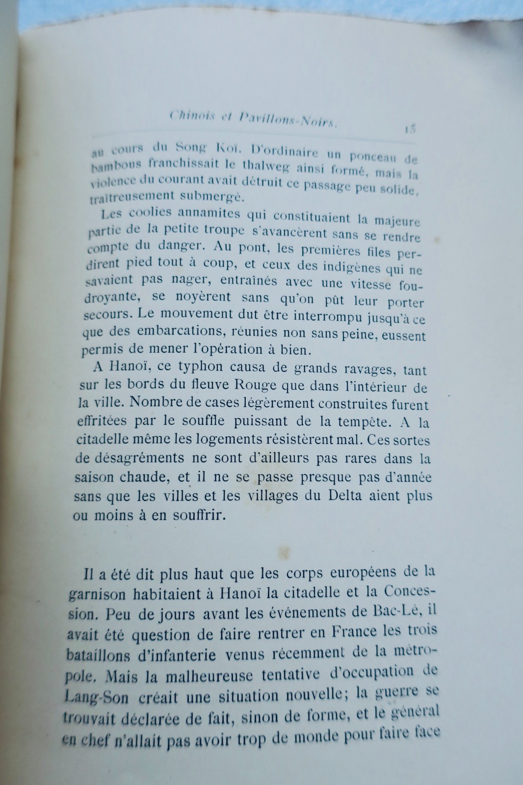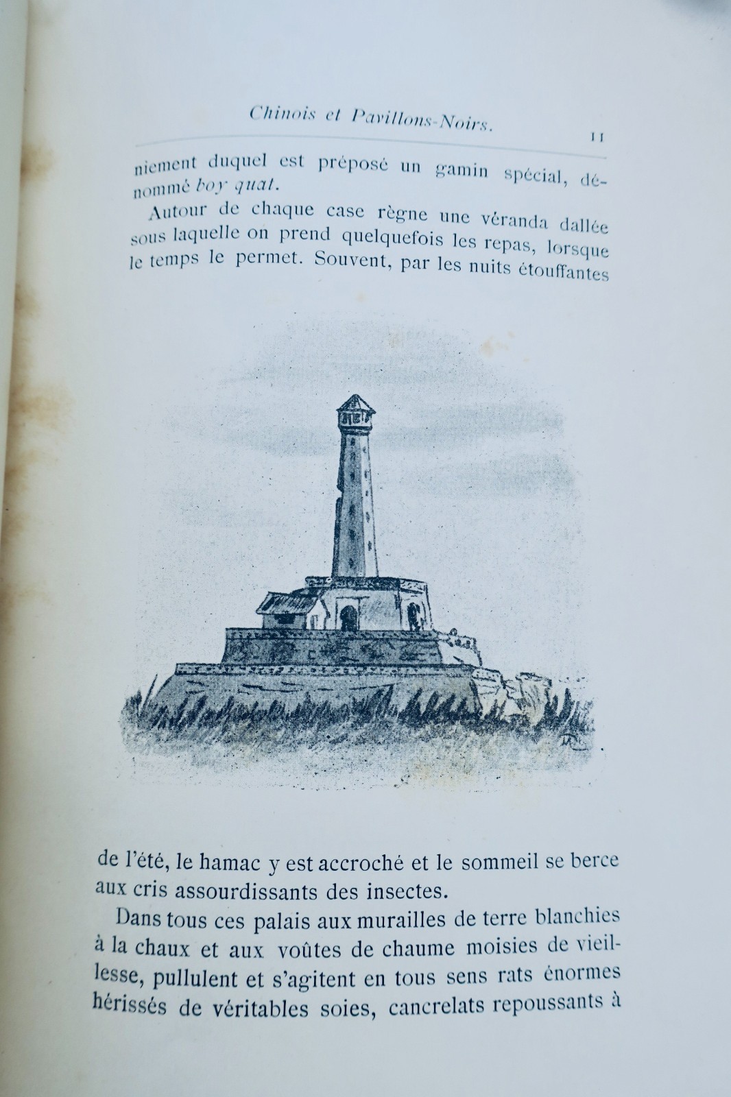 P., Marpon et Flammarion s.d. (1888). petit in-8°, broché (couverture abimée, débroché, dos grignoté), 228 pp., orné d’illustrations en noir dans le texte et de hors-texte en couleurs par Marie Traverse,. Chinois et Pavillons Noirs, Les rebelles du Nghé-An
