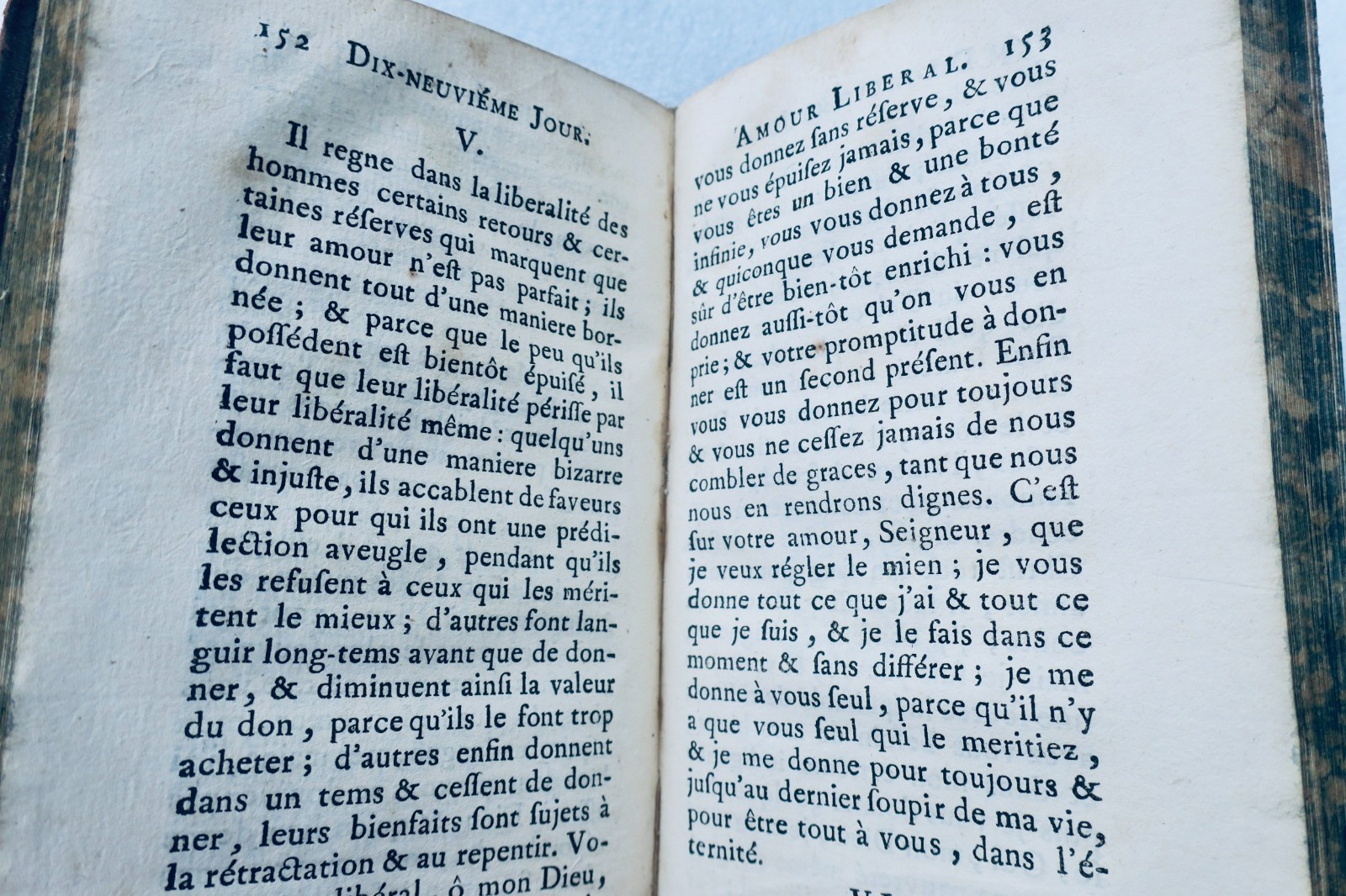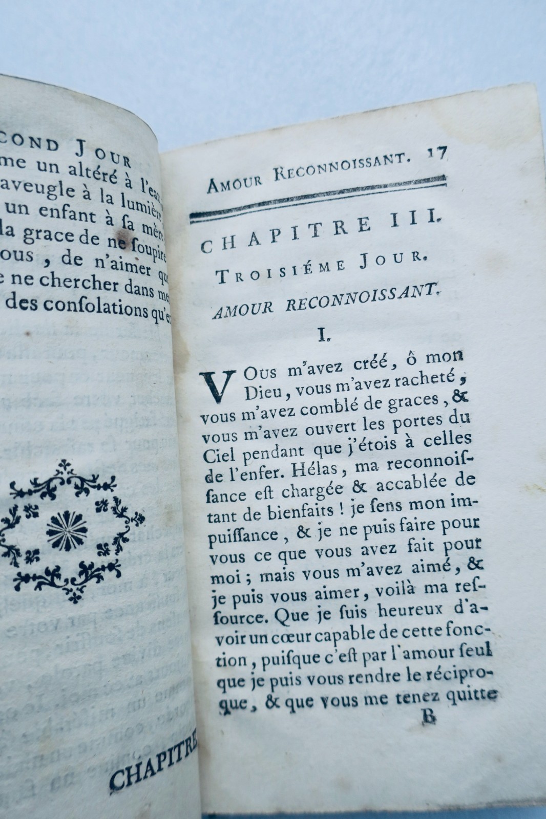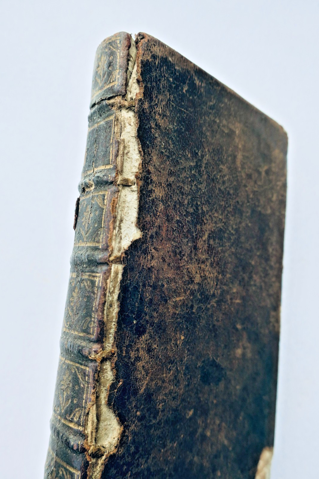A Paris, chez la Veuve Pierres, 1763, 104 x 168 mm., reliure plein cuir, manques sur les plats, mors fissurés, 251 pp.