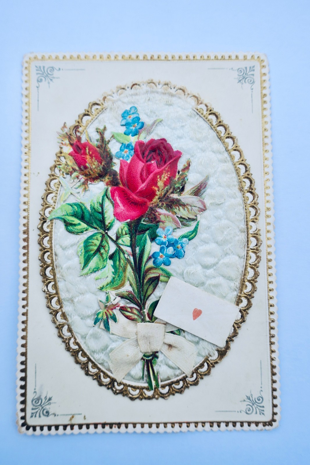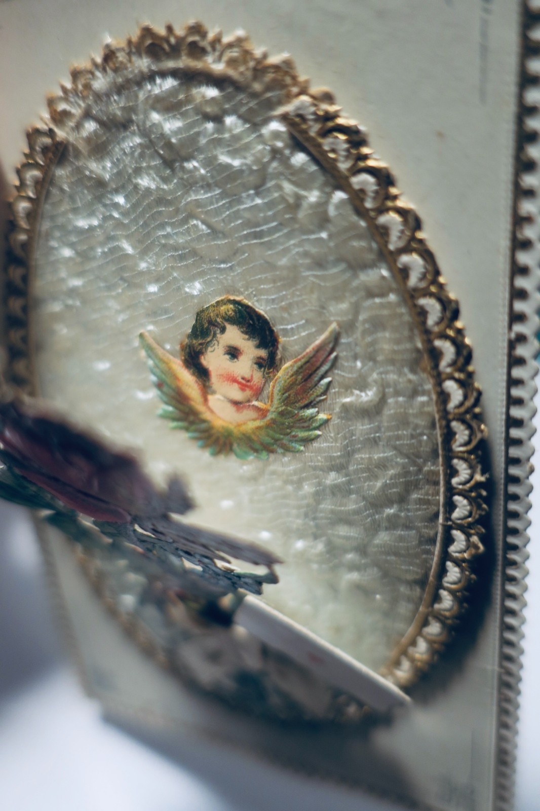 Un bouquet de roses devant un angelot sur petit médaillon garni de soie dissimulant un fin un médaillon à la colombe