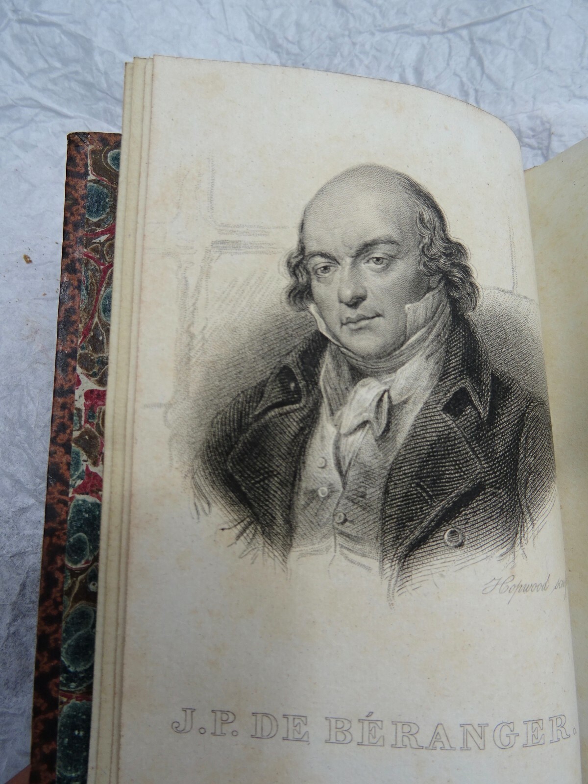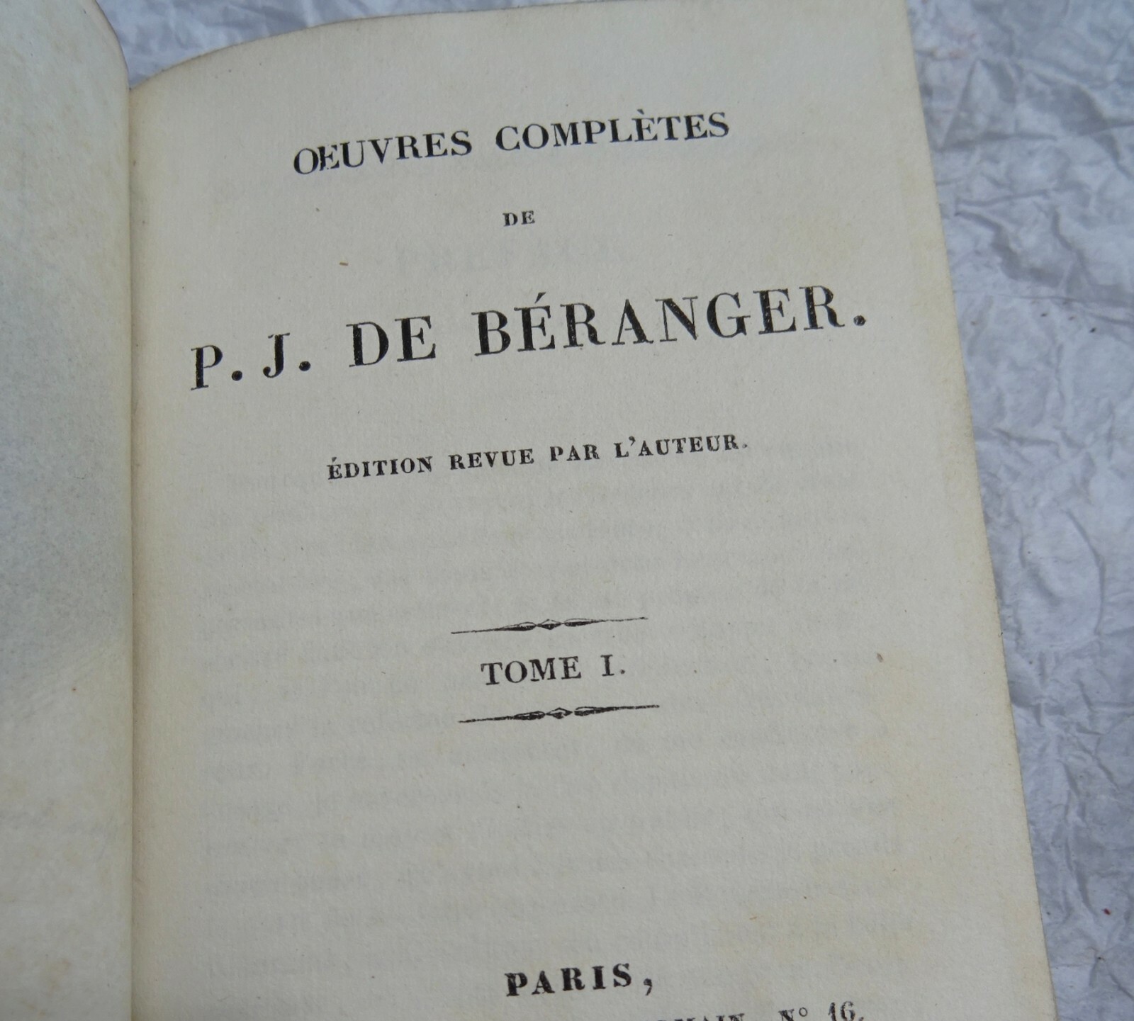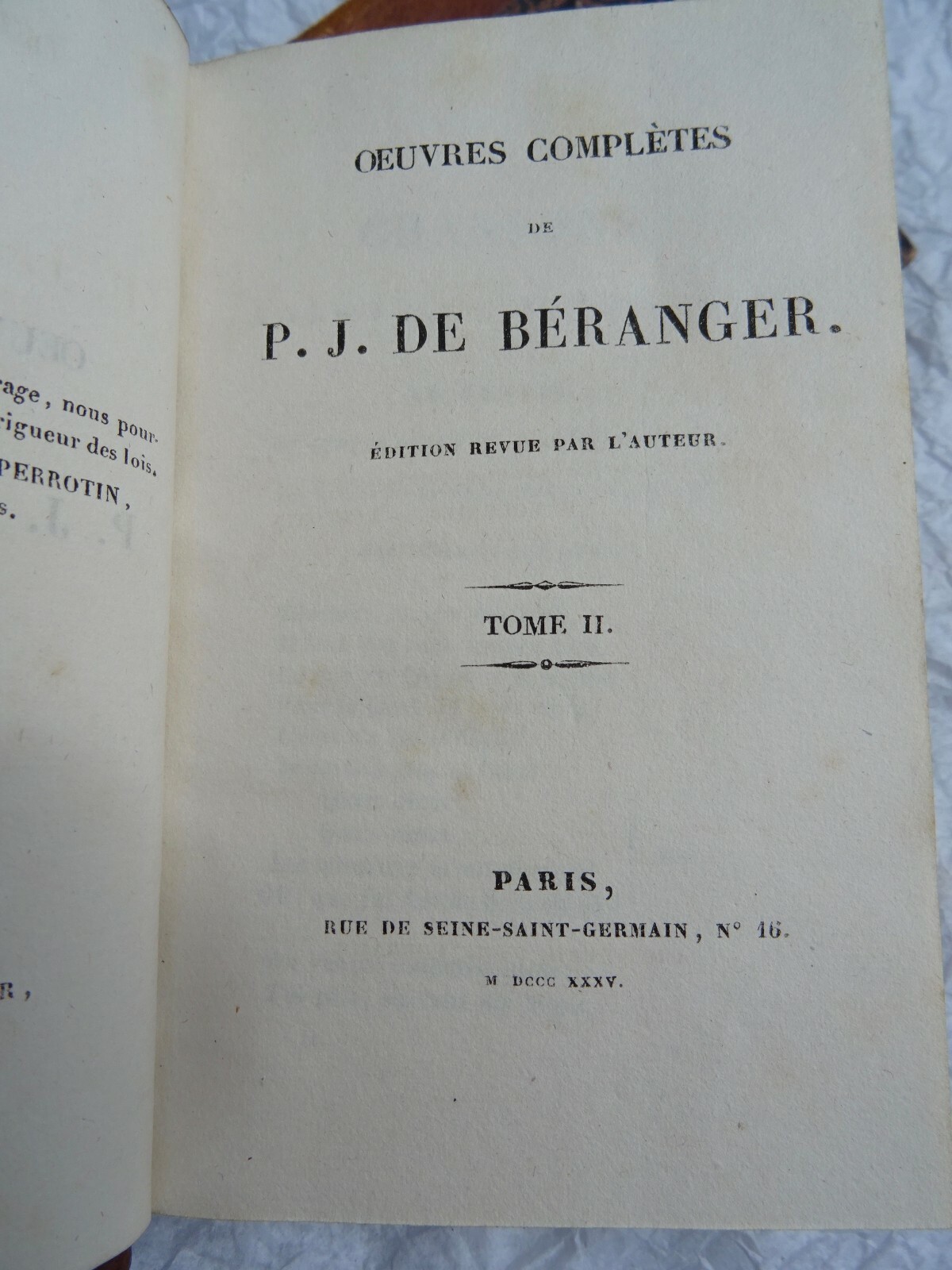 RUE DE SEINE SAINT GERMAIN, Paris. 2 volumes, 1835, belle petite reliure demi-cuir, in-16, 80 x 125 mm., 331 pp., 340 pp. Le premier volume contient les chansons composées entre 1813 et 1818, le second de 1818 à 1832. Edition revue par l’auteur.
