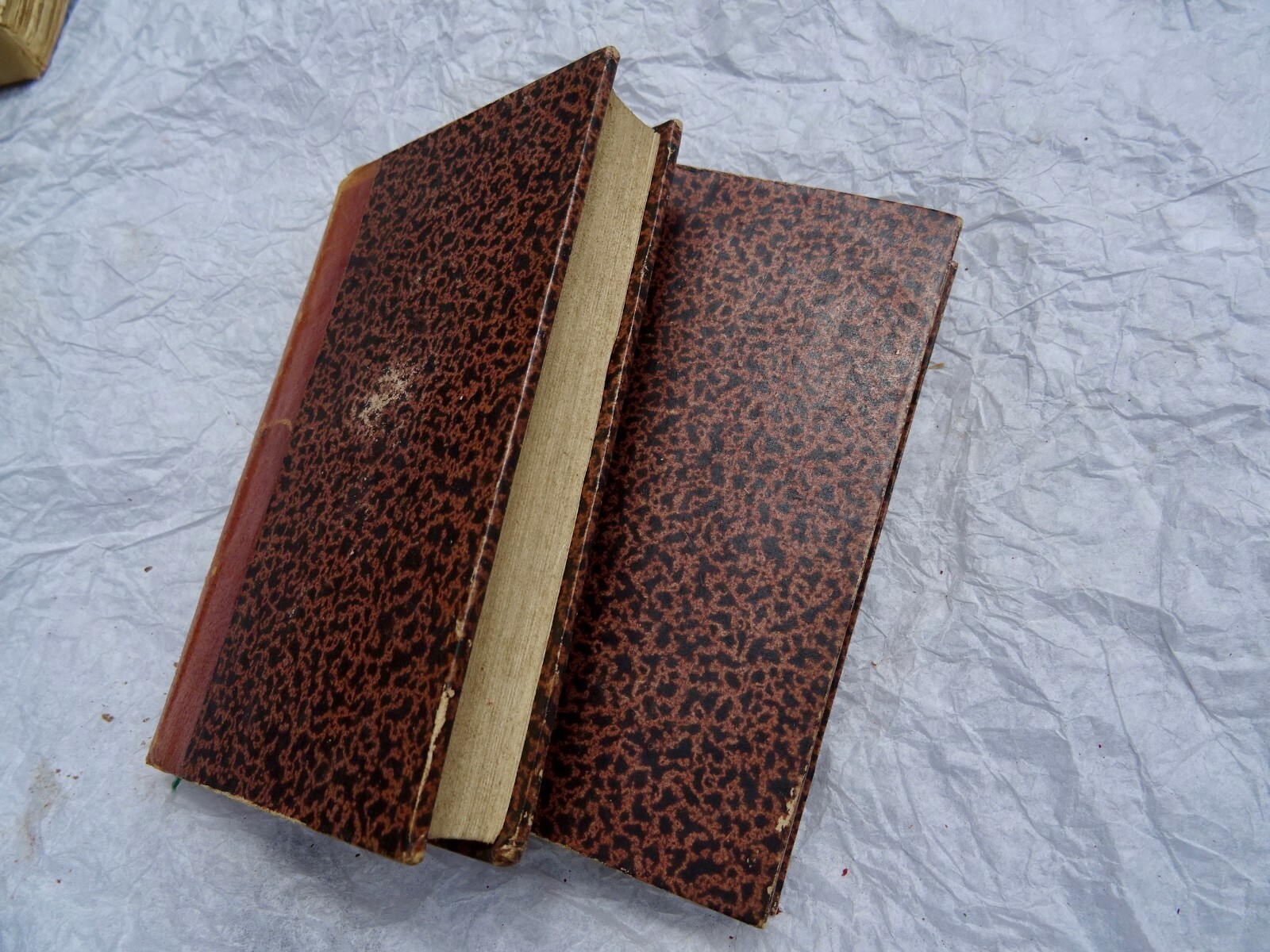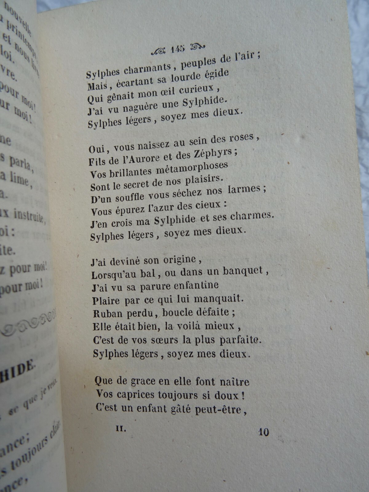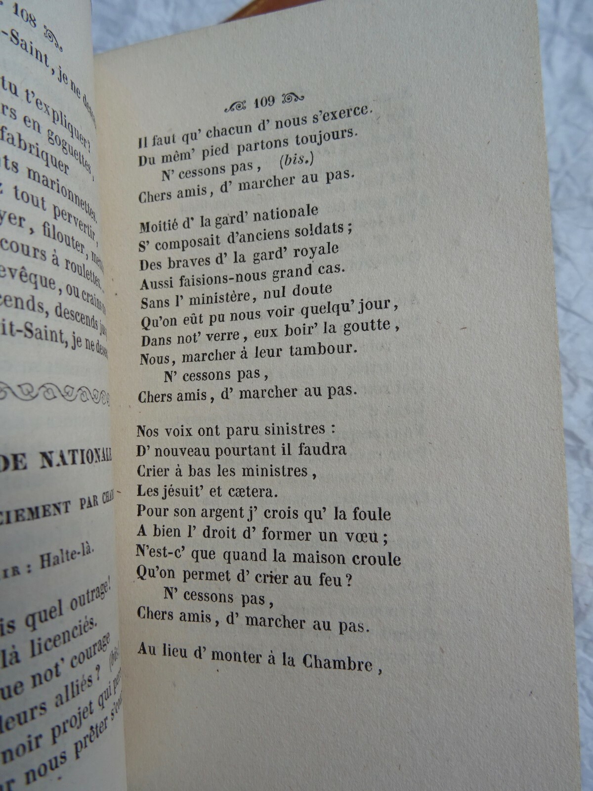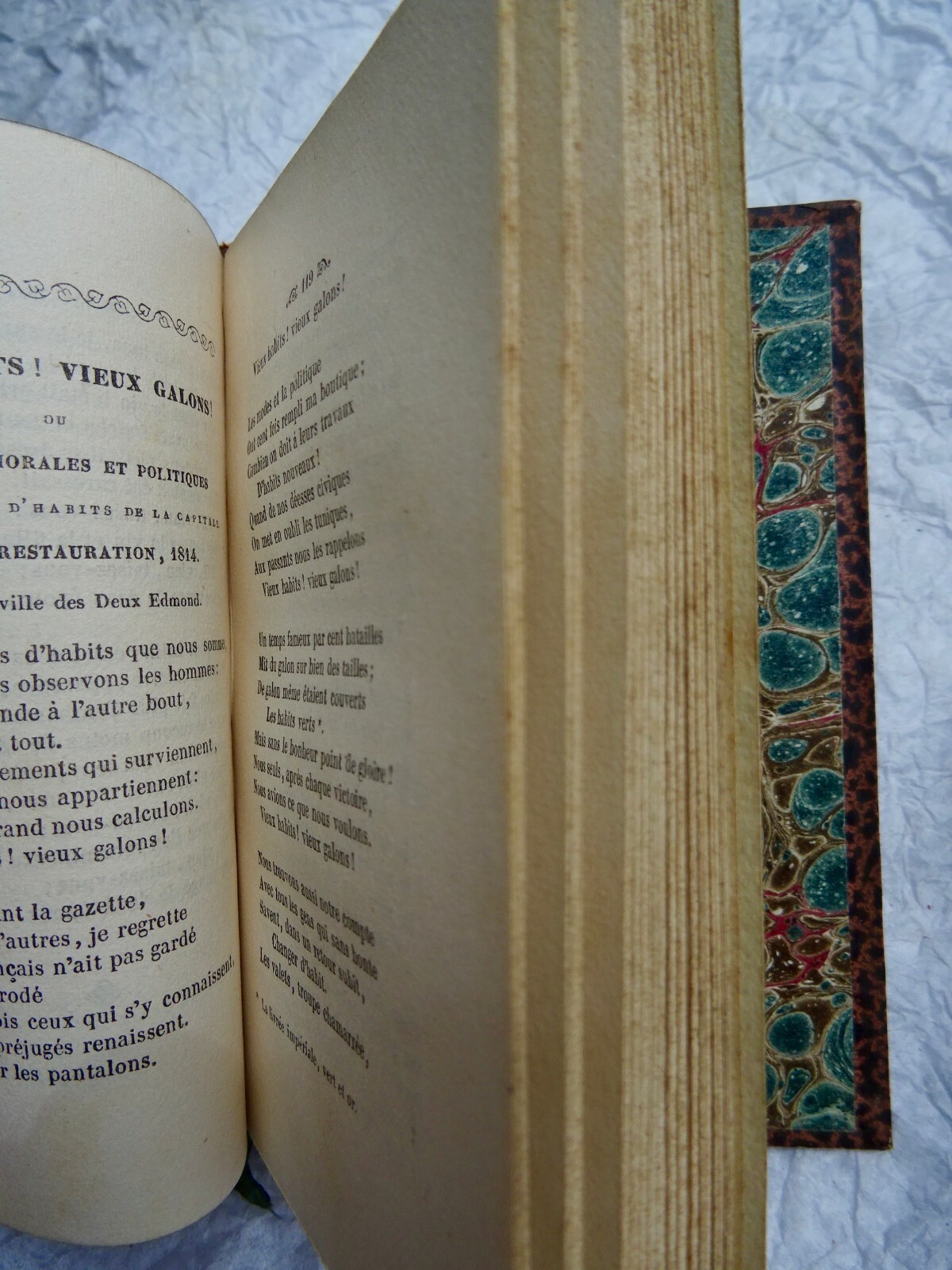 RUE DE SEINE SAINT GERMAIN, Paris. 2 volumes, 1835, belle petite reliure demi-cuir, in-16, 80 x 125 mm., 331 pp., 340 pp. Le premier volume contient les chansons composées entre 1813 et 1818, le second de 1818 à 1832. Edition revue par l’auteur.