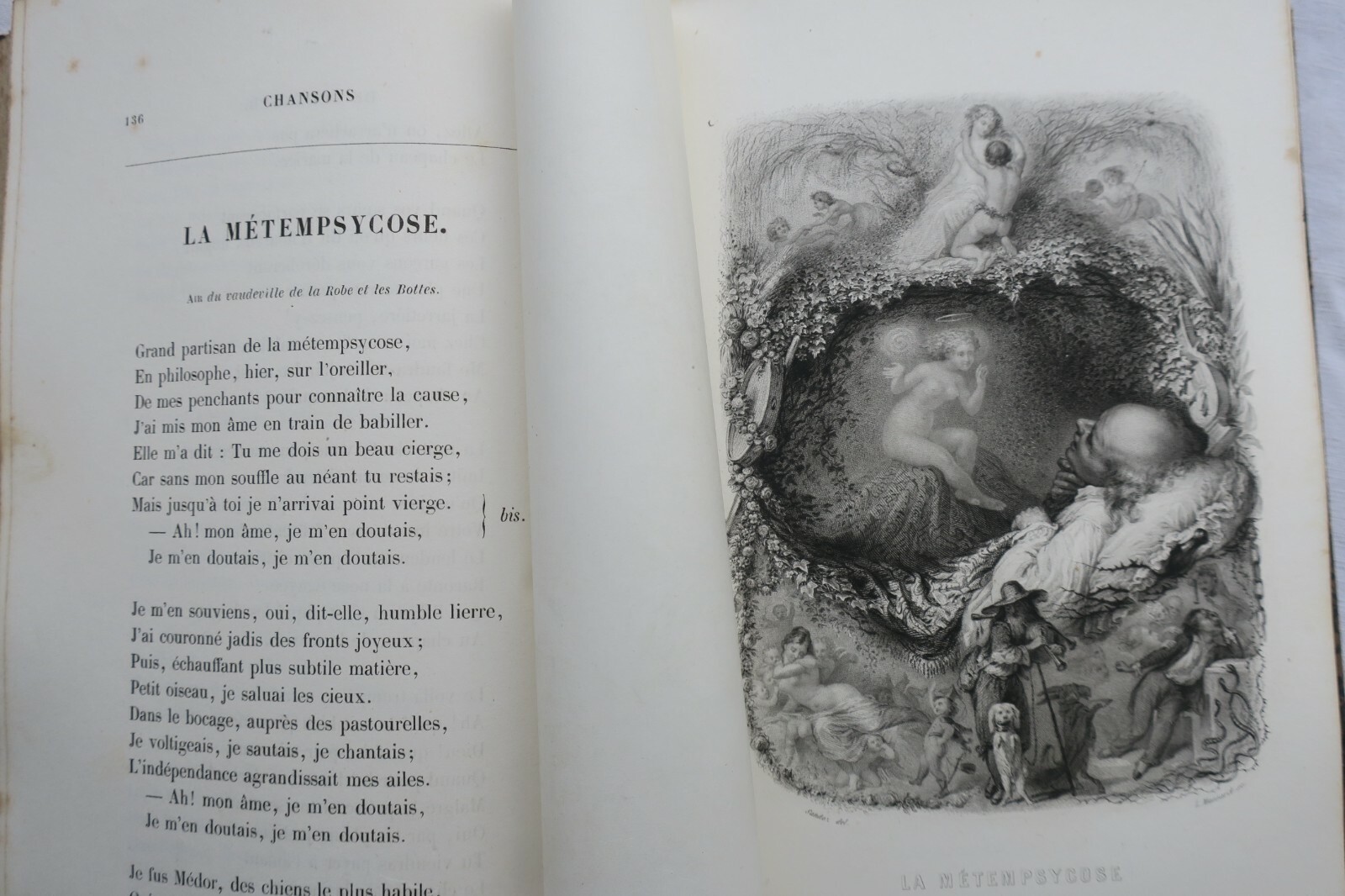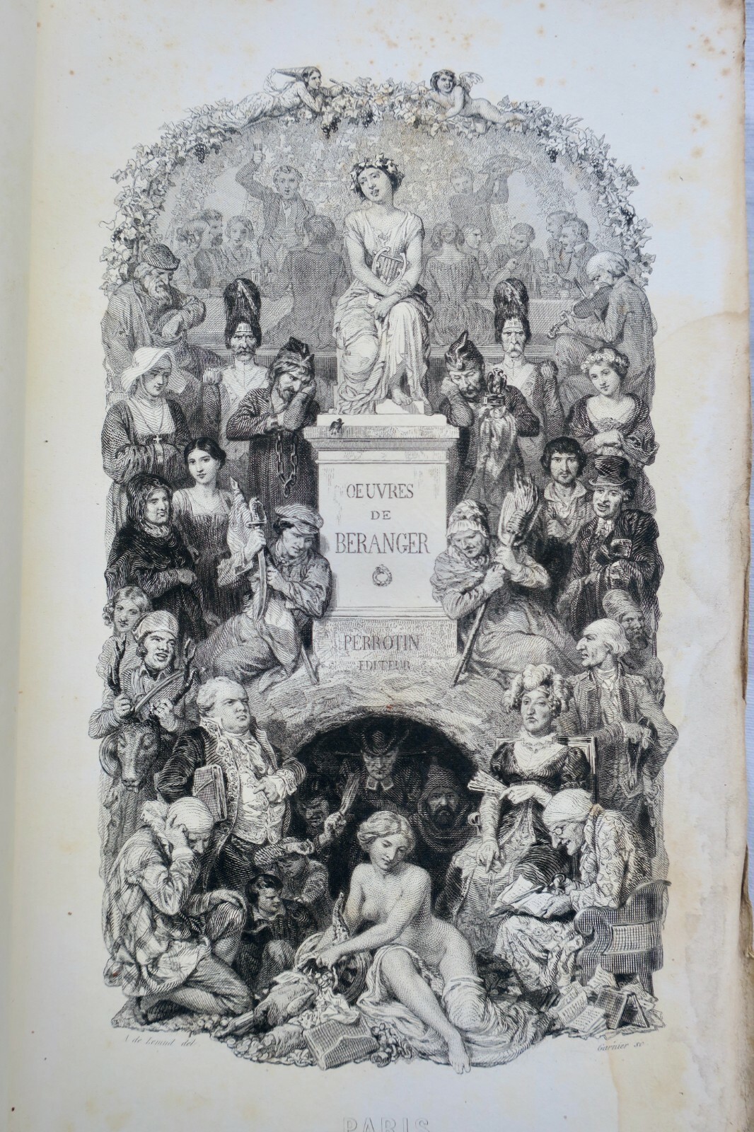 Oeuvres complètes de P.J. Béranger. Nouvelle édition revue par l’auteur. Illustrée cinquante-deux belles gravures sur acier, entièrement inédites, d’après les dessins de MM. Charlet, A. de Lemud, Johannot, Daubigny, Pauquet, Jacques, J. Lange, Penguilly, de Rudder, Raffet.
