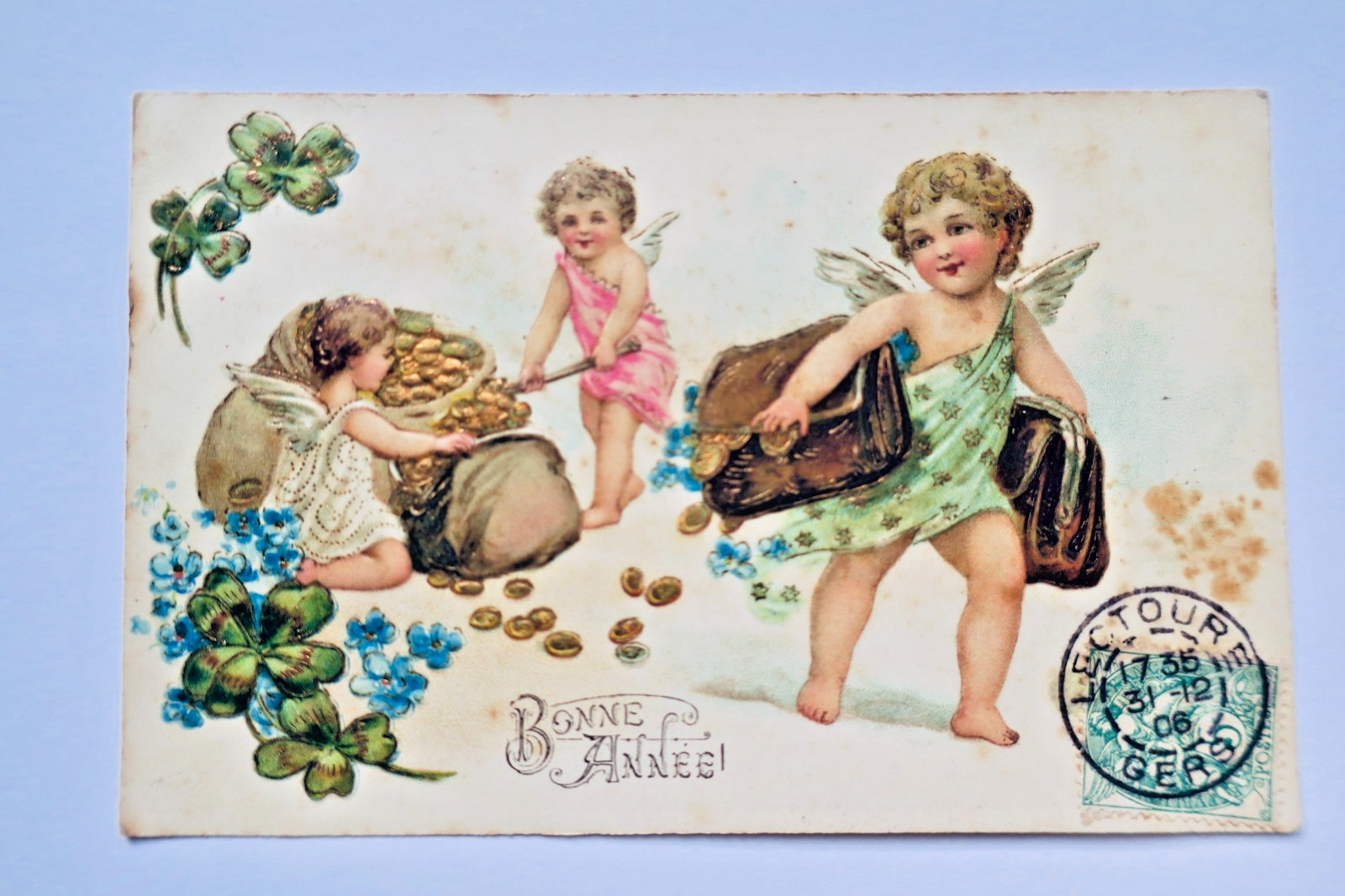 Bonne année 1906. BONNE ANNEE gaufré & relief. BONNE ANNEE broderies et gaufrées. VOEUX SINCERES DE BONNE ANNEE relief gaufrée. Bonne année 2 cpa broderies.