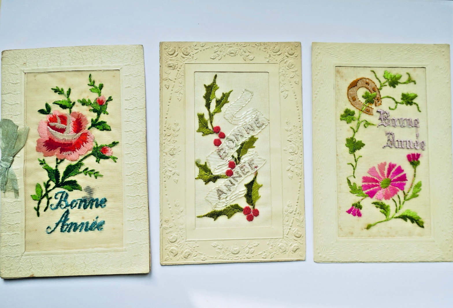 Bonne année 2 cpa broderies. Heureuse année peint à la main translucide.