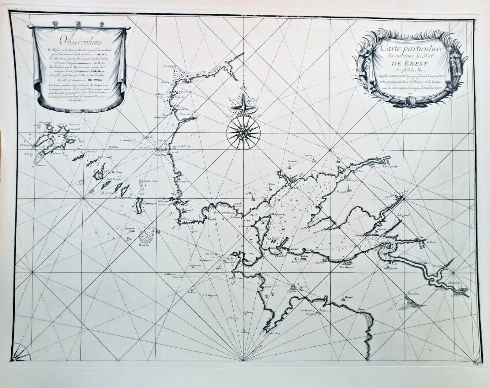 Carte particulière des environs du port de Brest du côté de la mer laquelle contient tout le pays qui est entre le mesme port et les paysage du four, de l’Iroize et du Raz avecles obervations et les marques de tous les dangers