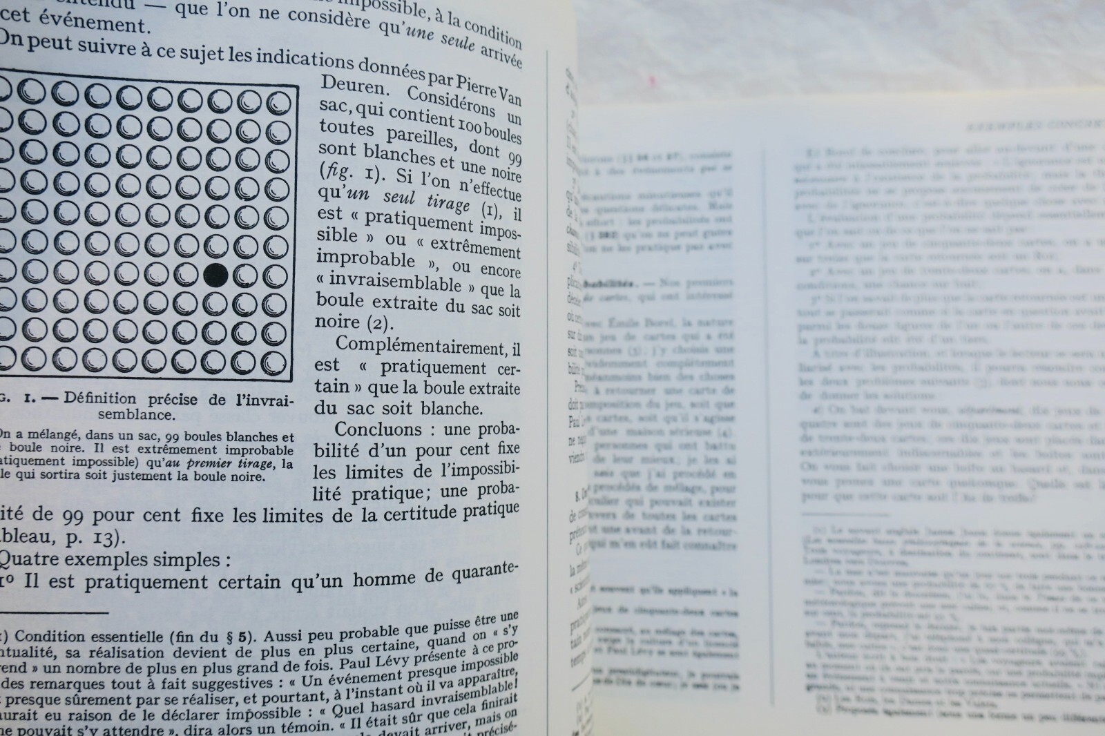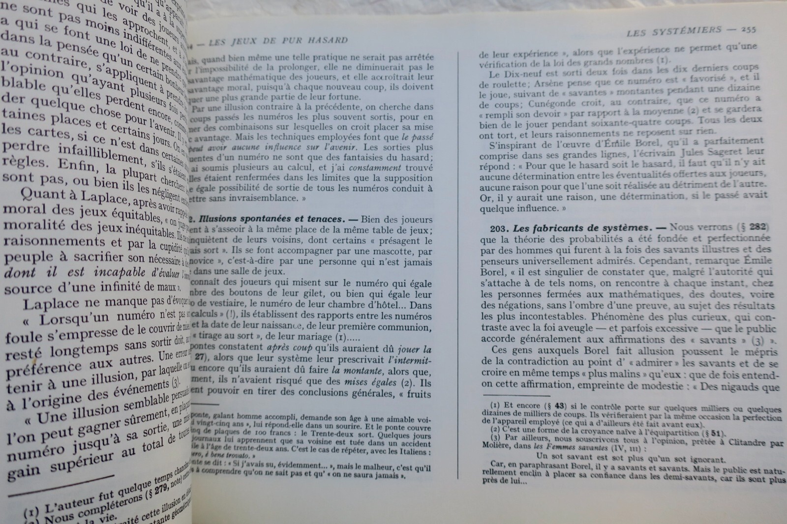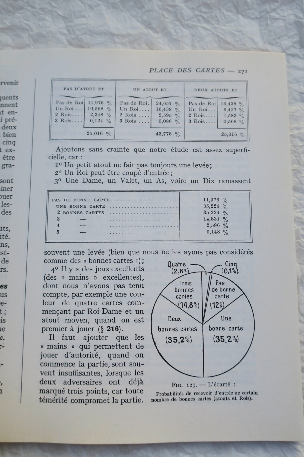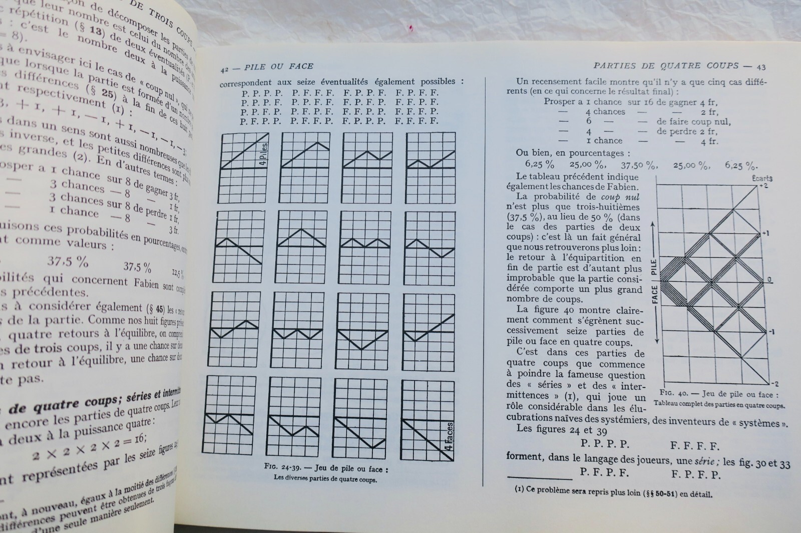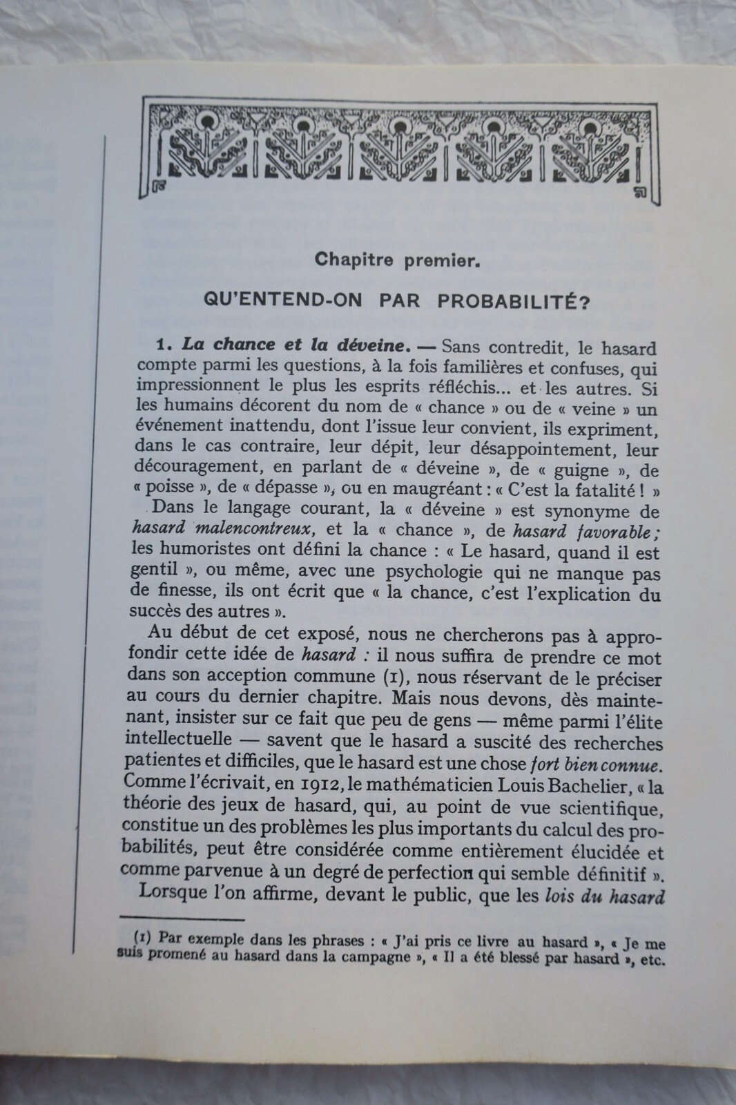Introduction – Qu’entend-on par probabilités – Curiosités mathématiques – Le jeu de pile ou face, parties courtes, la fin des longues parties, les péripéties des longues parties, les martingales ou la ruine des joueurs – Les dés – Le poker d’as – Loterie et sweepstake – La boule, chances simples, numéros pleins, le jeu des avions – La roulette, chances simples, chances multiples et double roulette – Le trente et le quarante – Le baccara, conditions préliminaires, tactique du ponte, riposte du banquier – Les jeux de pur hasard – L’écarté – La belote – Quelques autres jeux – Le poker – Le bridge – Les jeux de semi-hasard – La chance et sa destinée