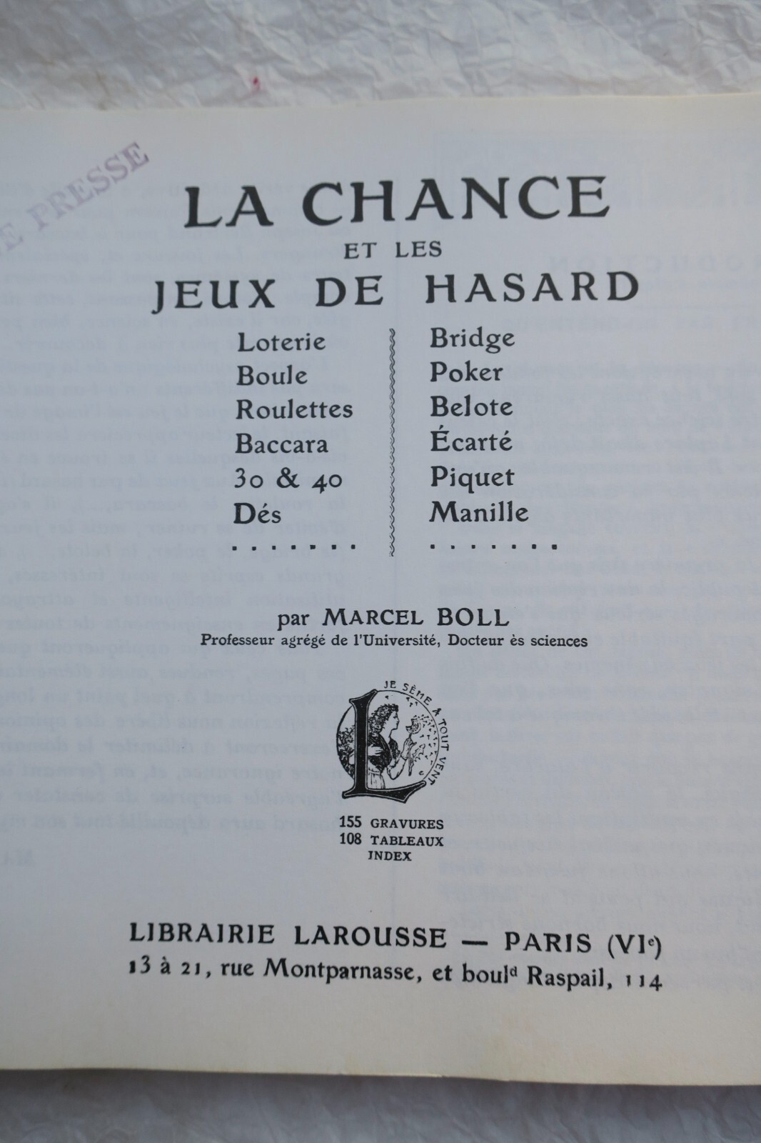 La chance et les jeux de hasard – Loterie, boule, roulettes, baccara, 30 et 40, dés, bridge, poker, belote, écarté, piquet, manille (Reprint 1992 de l’édition Larousse de 1948)