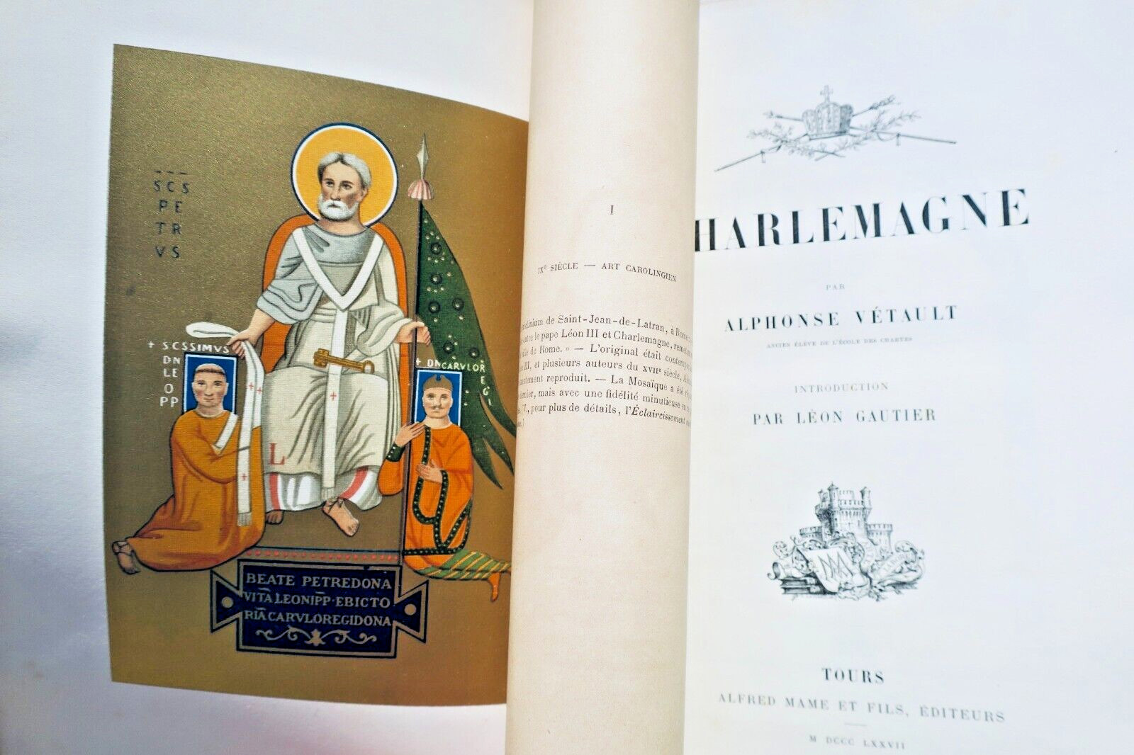 Alfred Mame et Fils, 1877, in 4°, reliure demi-chagrin cerise à coins, tête dorée, usures en coins et aux bords, XXV-556 pp. avec 22 planches hors texte dont 3 en couleurs, 1 carte coloriée dépliante et le fac-similé dépliant d’un diplôme, quelques discrètes rousseurs.