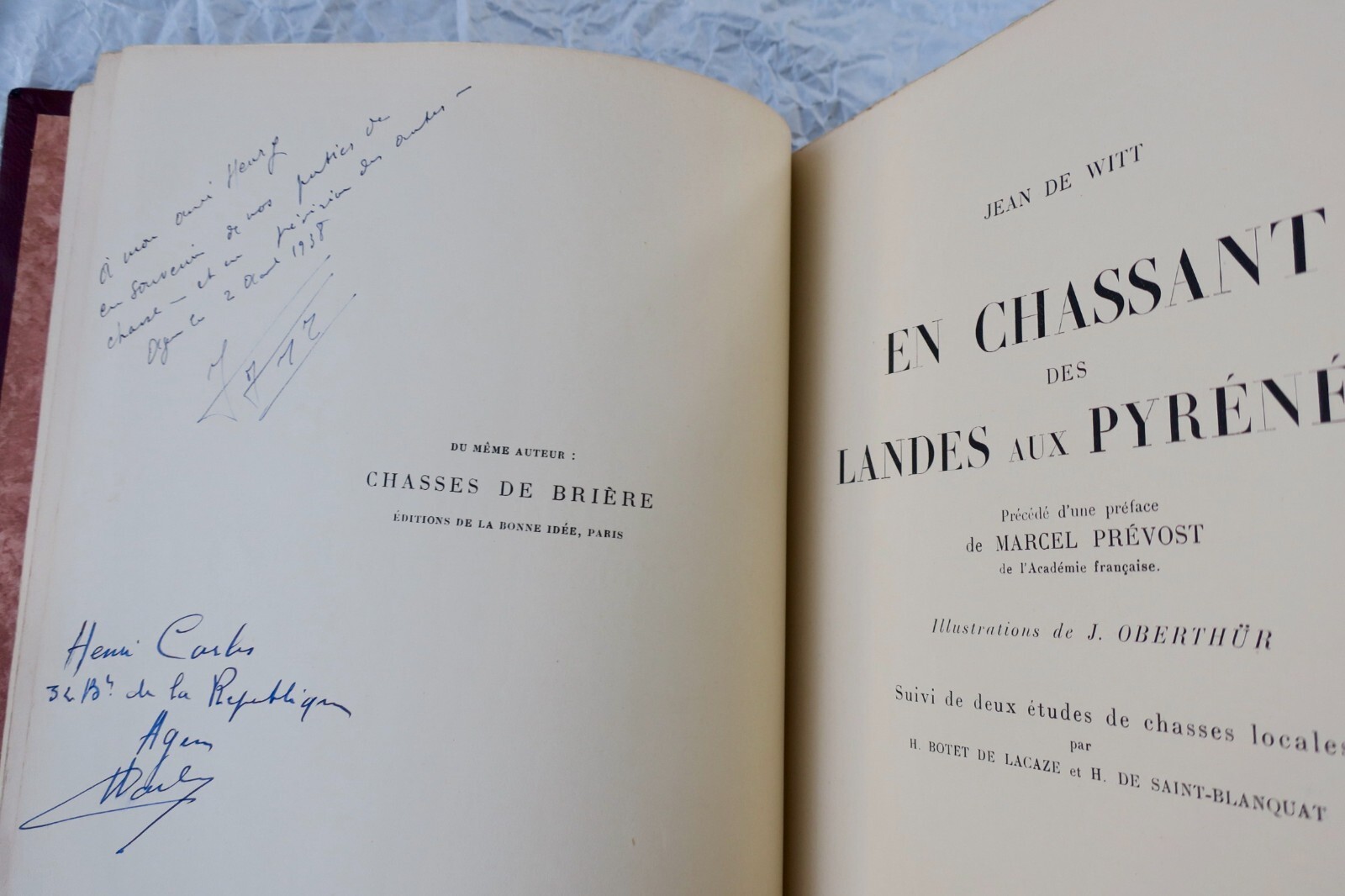Jean de Witt. En chassant des Landes aux Pyrénées. Précédé d’une préface de Marcel Prévost,… Illustrations de J. Oberthür, suivi de deux études de chasses locales, par H. Botel de Lacaze et H. de Saint-Blanquat