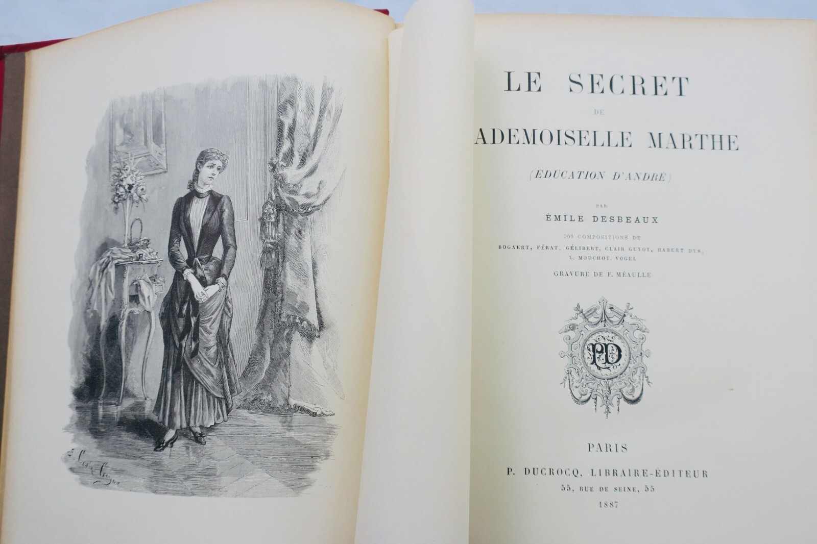 P. Ducrocq, Paris, 1887, in 4°, belle reliure percaline, aux bords bisautés, tranches dorées bien réglées, le mors du dernier plat fissuré sur la moitié de la hauteur, petites usures en coiffes & sur un coin. 100 compositions en noir dans le texte et hors-texte par MM. Bogaert, Férat, Gélibert, Clair Guyot, Habert Dys, L. Mouchot, Vogel, gravure de F. Méaulle.