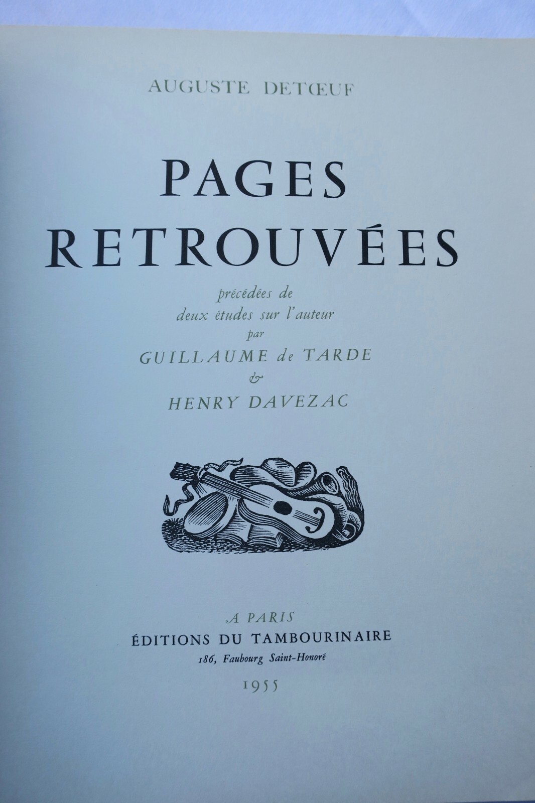 PAGES RETROUVEES precédées de deux études sur l’auteur par GUILLAUME DE TARDE & HENRY DAVEZAC DU TAMBOURINAIRE. 1955. In-8 Carre. Broché (couverture défraichie), 127 pages. Quelques bandeaux et culs-de-lampes en noir et blanc ou vert et blanc.