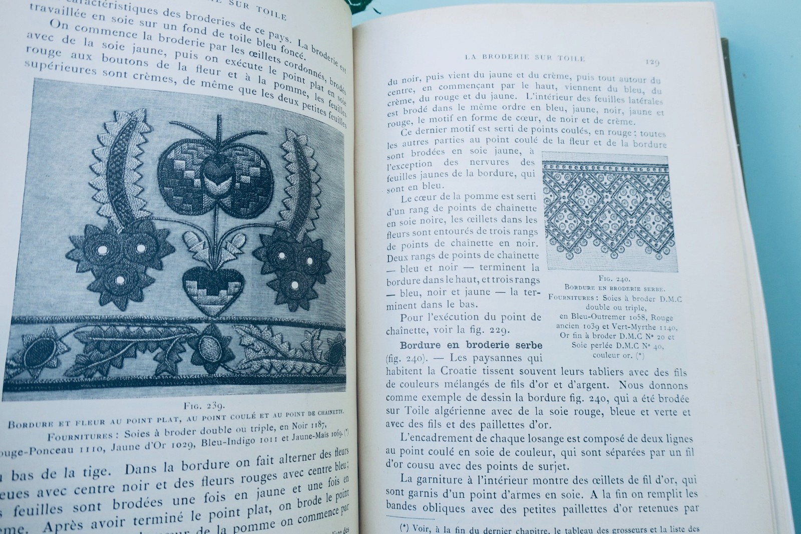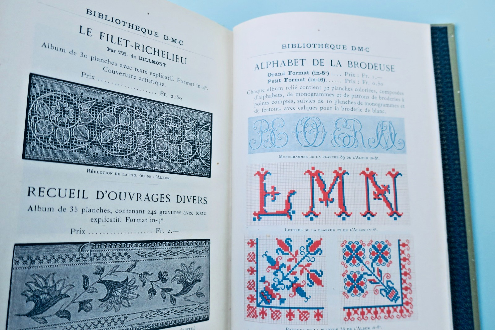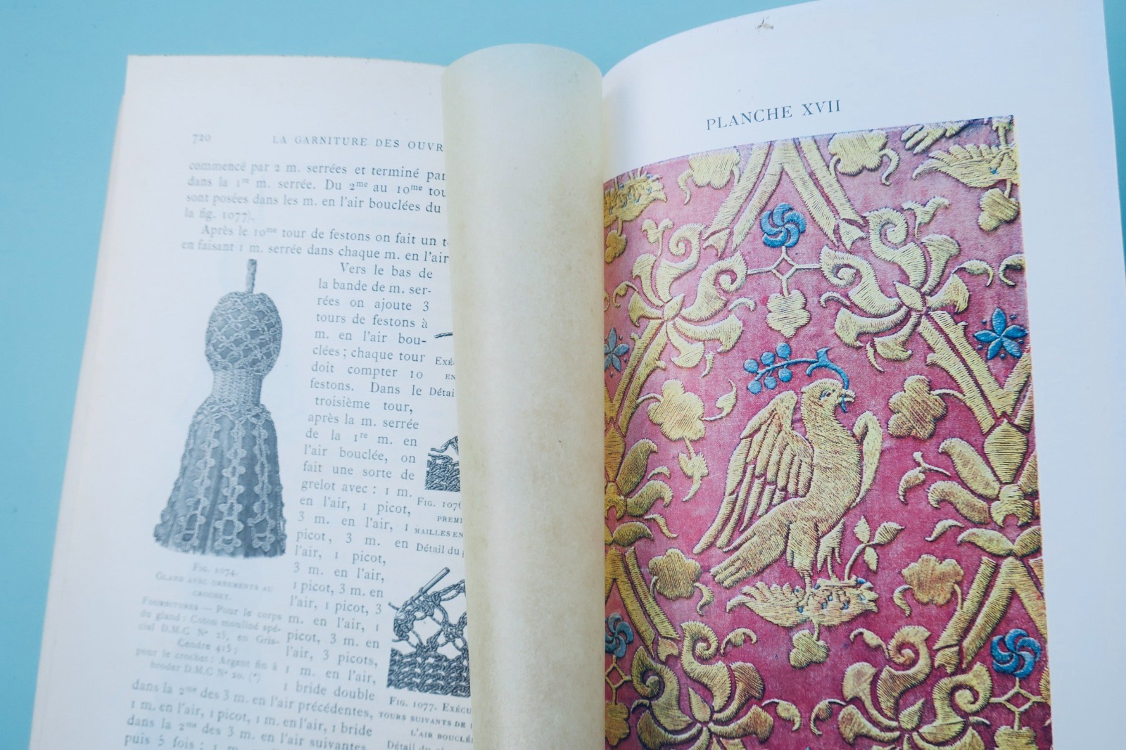 Dornach (Alsace), Th. de Dillmont, coll. « Bibliothèque D.M.C. « , vers1900, In-8°. Reliure de l’éditeur percaline (passée), 4-742 pp. tableau des couleurs et des grosseurs-catalogue 30 pp., 1087 figures, 17 planches en couleurs hors-texte sous serpentes. couture, raccomodage, Broderie, tapisserie, tricot, crochet, frivolité, macramé, jours, dentelles…