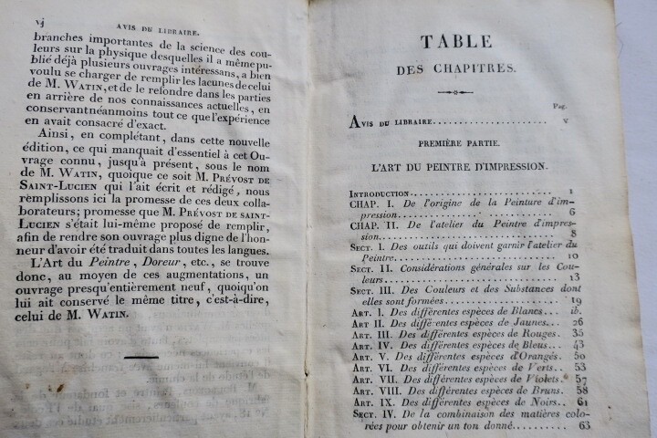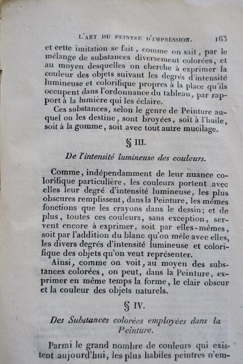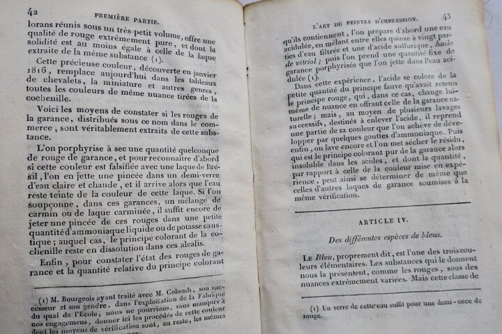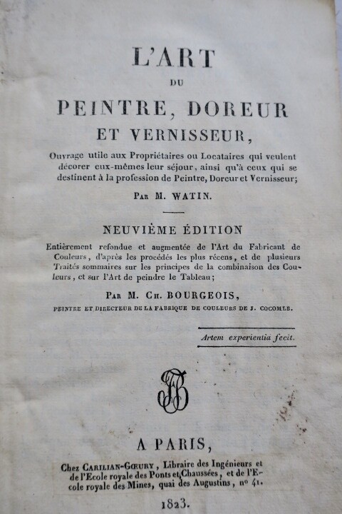 Chez Carilian-Goeury, Paris, 1823, reliure demi-cuir (en l’état: intérieur bien conservé) XII-423 pp. 9ème édition, entièrement refondue et augmentée de l’Art du Fabricant de Couleurs, par Ch. Bourgeois.