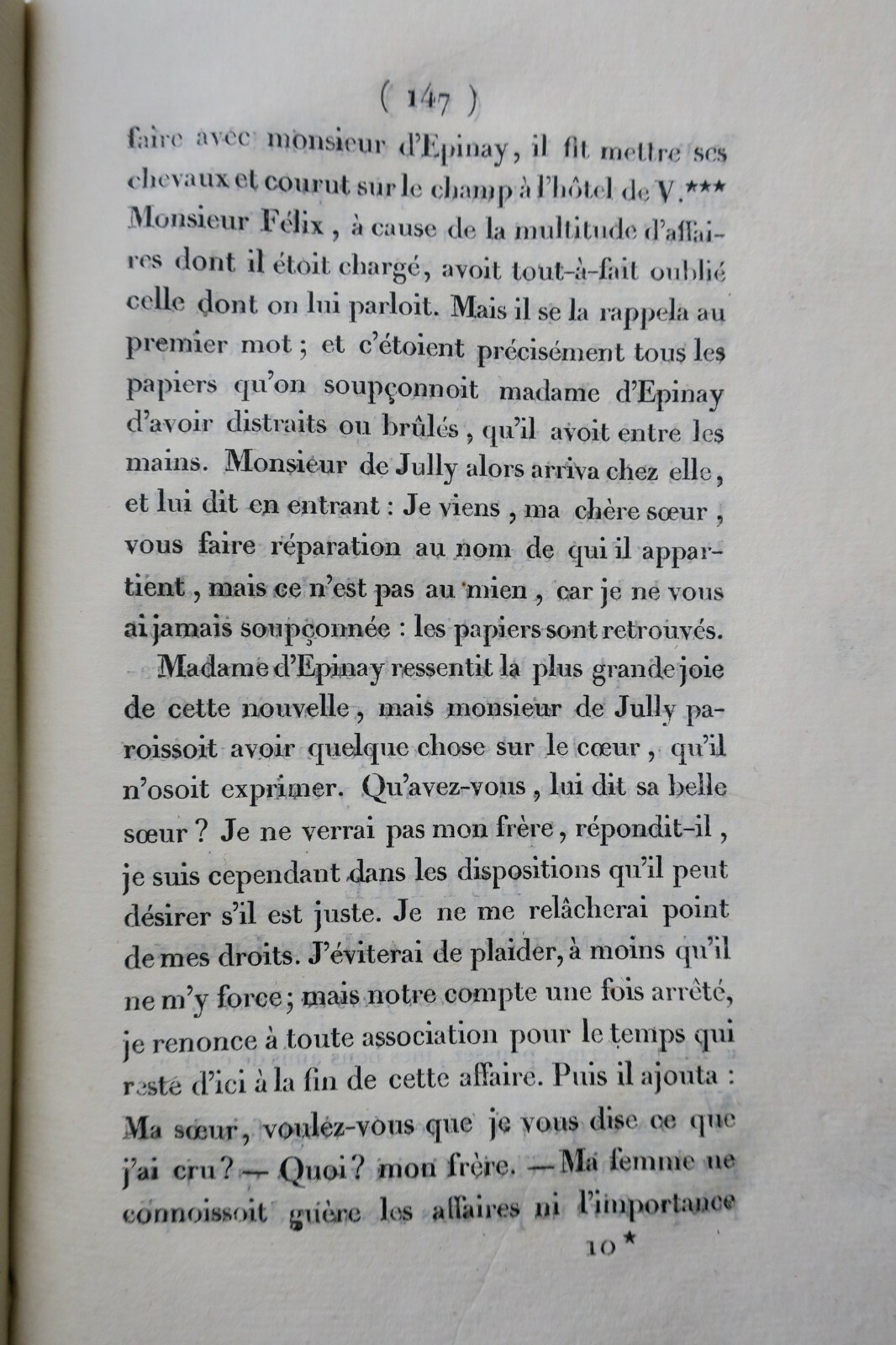 A Paris, Chez Brunet, 1818, in-8, 407 pp., belle reliure demi-cuir, tranches citron, EDITION ORIGINALE posthume. Considéré comme un des chefs-d’oeuvre de la littérature feminine du XVIIIeme siècle. Tome second seul