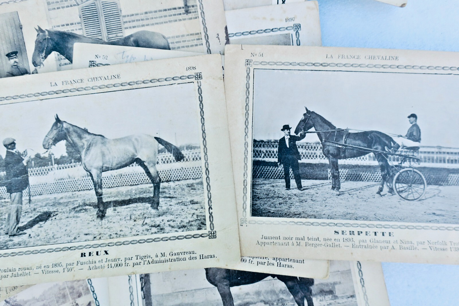 Rare ensemble de 345 cartes, (12 x 16 cm), illustrations noir et blanc contre-collées & montées sur un support cartonné, (quelques rousseurs pâles, quelques petits défauts sur les support cartonnés, plus rarement sur l’image) : poulains, juments et étalons…comportant un certain nombre d’indications (non exhaustives à chaque fois) comme le nom du cheval, son dépôt, haras, écuries, jumenterie, le nom du père & de la mère, une courte description physique de l’animal, sa race, son année de naissance, d’autres fois le nom du cavalier ou du propriétaire, entraineur, driver, les prix parfois remportés.. ou sa vitesse, sa taille.