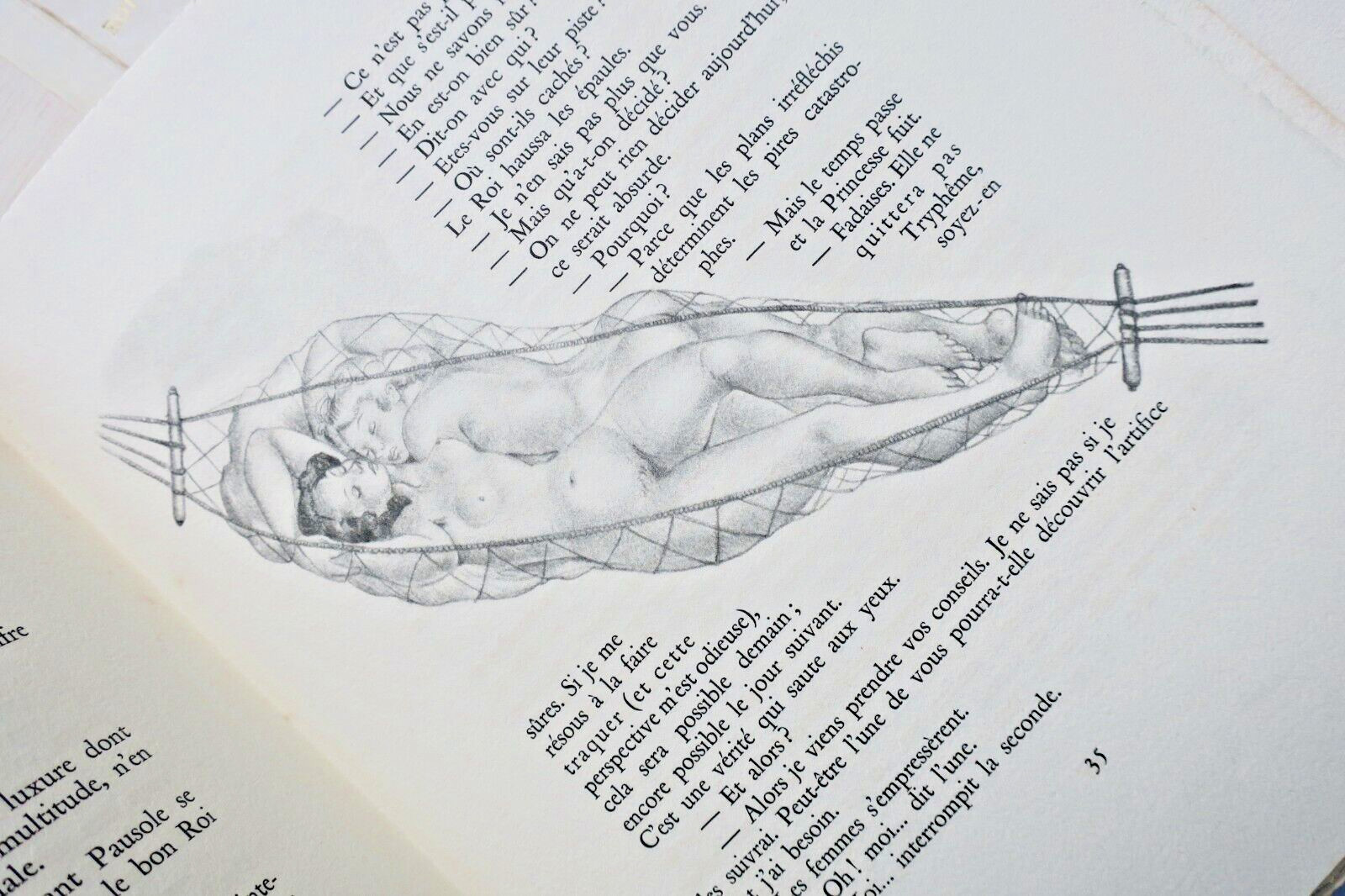 Monte-Carlo, Editions du Livre, s.d. (1945). In-4°, 247 pp., 1 f.n.ch., en feuilles, sous couverture rempliée illustrée, chemise dos ivoire, titre doré au dos, sous étui. Belle édition du chef d’oeuvre de Pierre Louys, illustré de planches hors-texte à caractère très libre par Suzanne Ballivet.