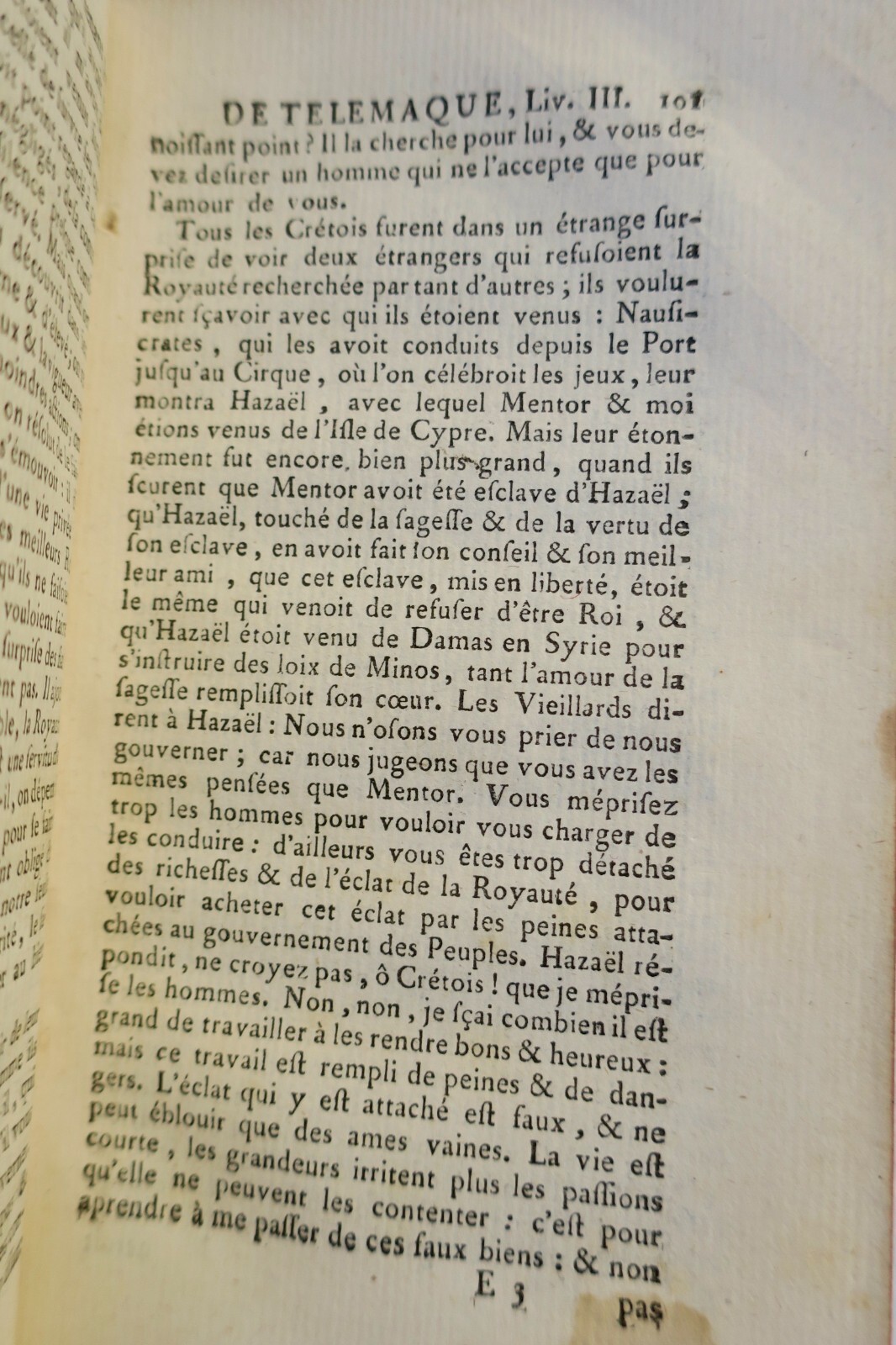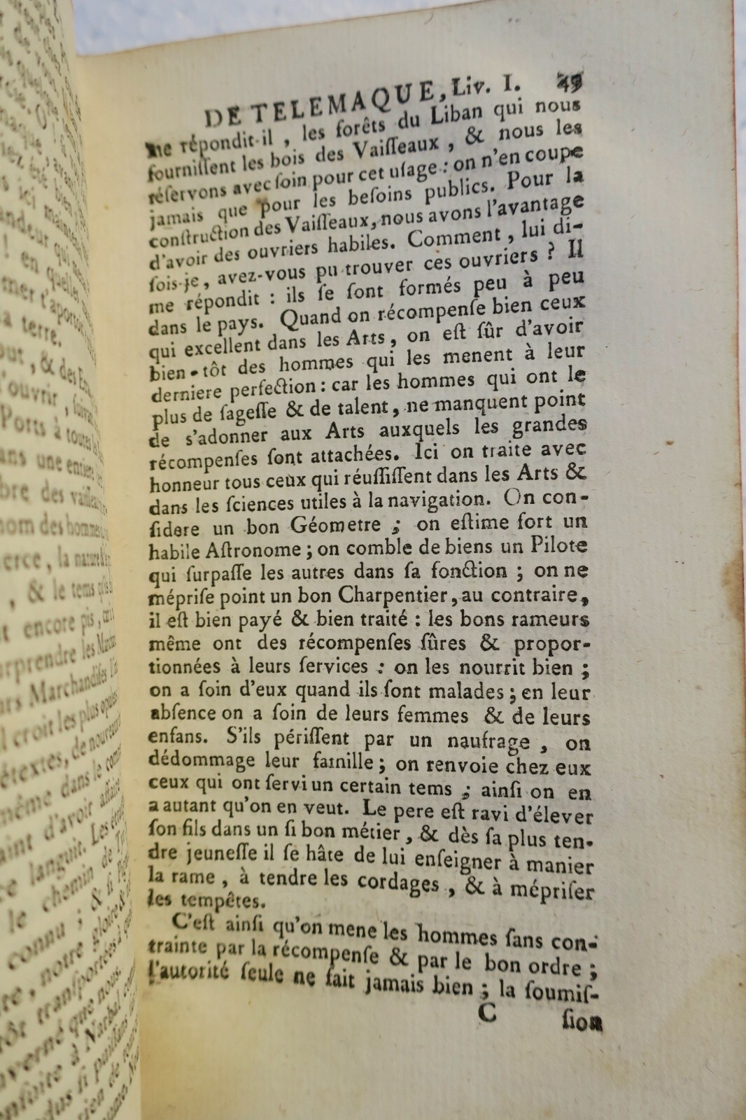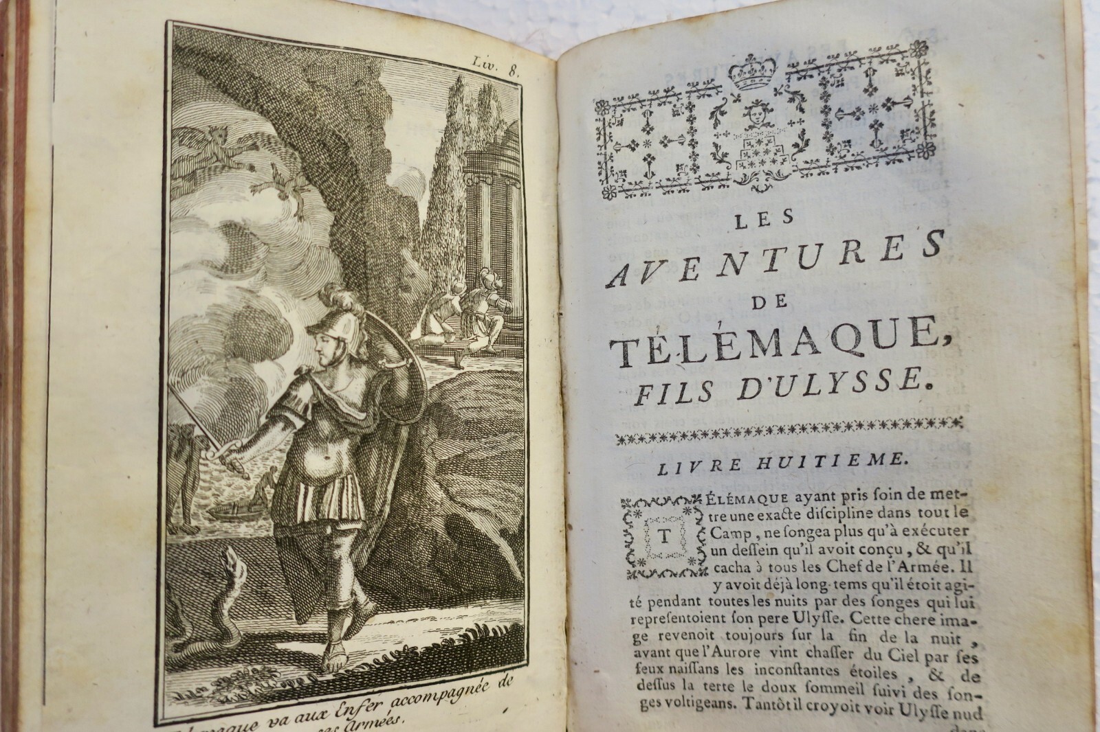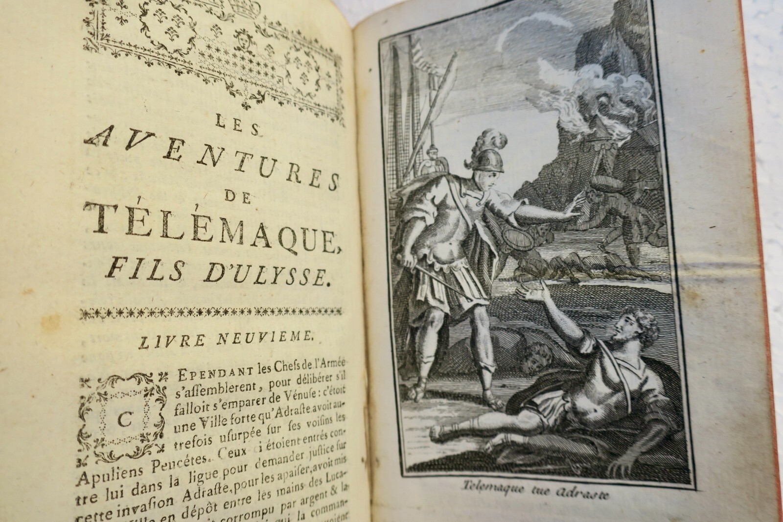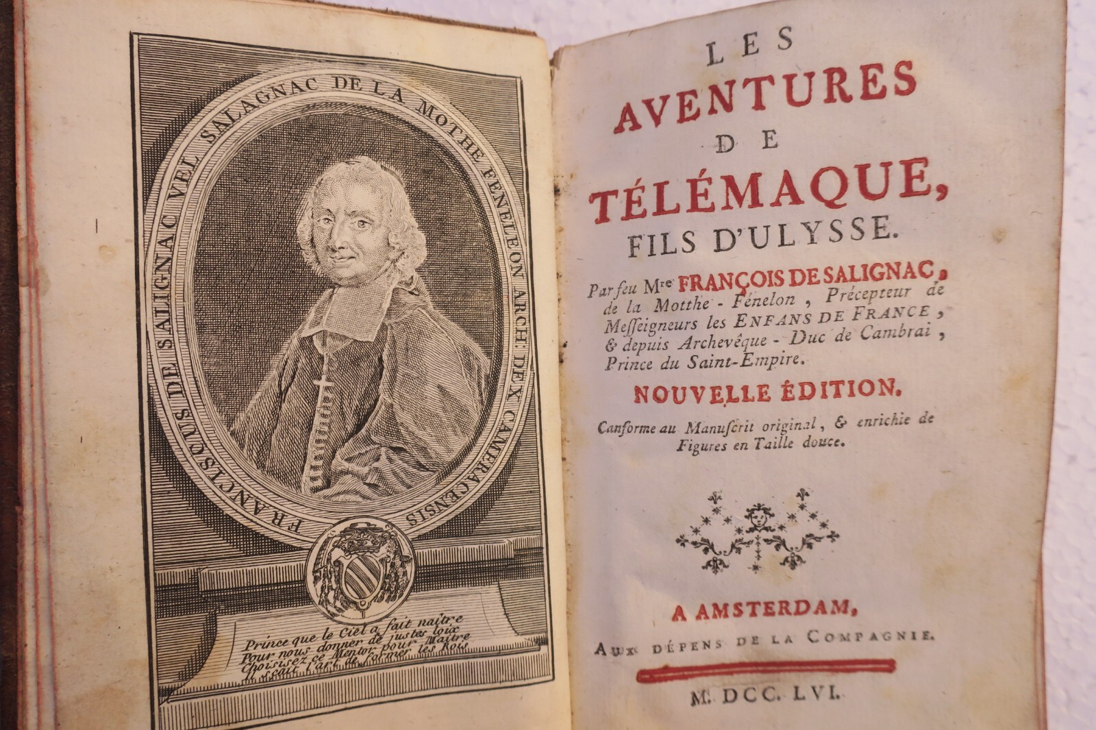 Les Aventures de Télémaque, fils d’Ulysse… Nouvelle édition… enrichie de figures en taille douce Amsterdam, aux dépens de la compagnie, 1756. In-12, reliure plein cuir, 2 coins émoussés, coupures en coiffes inférieures au niveau des mors, (10)- XXXVIII- 487 pp. frontispice et 9 figures hors-texte, quelques cahiers légèrement décalés, intérieur bien conservé.