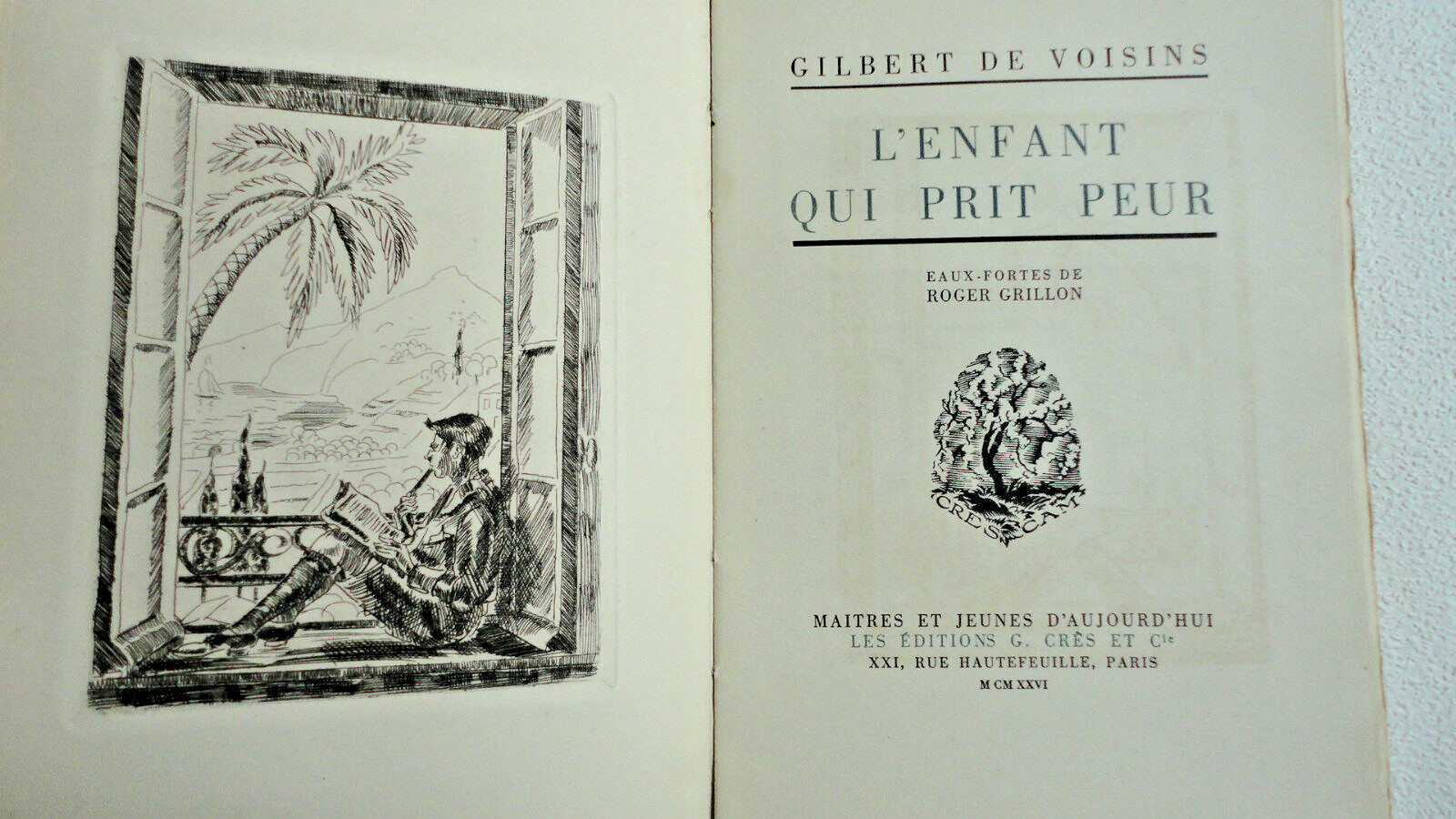 Les Editions G. Cres et Cie, Paris 1926 – Collection Maitres et Jeunes d’Aujourd’hui. Couverture souple crème rempliée, titres noirs et bleus, dos grignoté (absent) 283 pp. Texte illustre d’un frontispice, deux hors-texte et un bandeau in texte en eaux-forte par Roger Grillon.