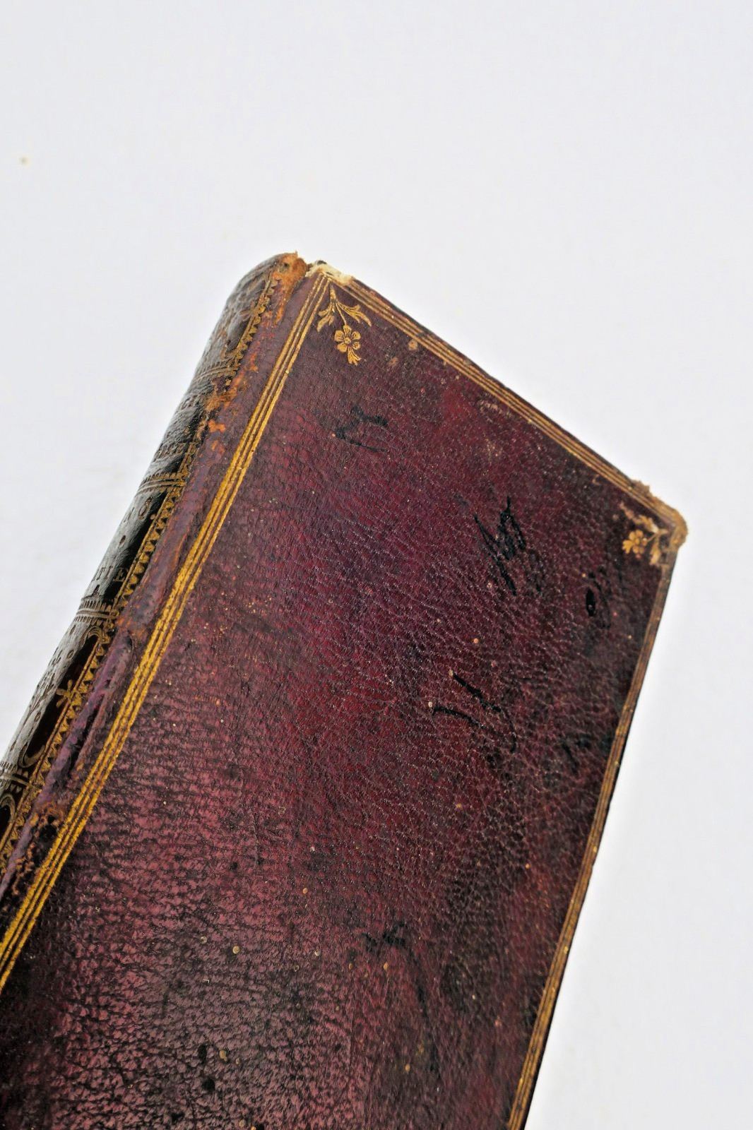 Carpentras, Quenin, 96 x 160 mm., reliure plein maroquin, XXXV & 326 pp., coins émoussés, petits manques en coiffes, manque le feuillet (121-122), gribouillis en pages de garde