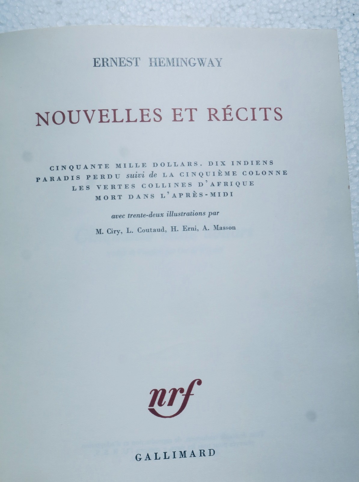 Gallimard, Paris, 1963, In-4° 828 pp., Reliure éditeur d’après la maquette de Paul Bonet, petites tâches brunes sur les tranches. 32 illustrations par M. Ciry, L. Coutaud, H. Erni, A. Masson. En bon état. Comprenant: Cinquante mille dollars, Dix indiens, Paradis perdu suivi de la cinquième colonne, Les vertes collines d’Afrique, Mort dans l’après-midi.