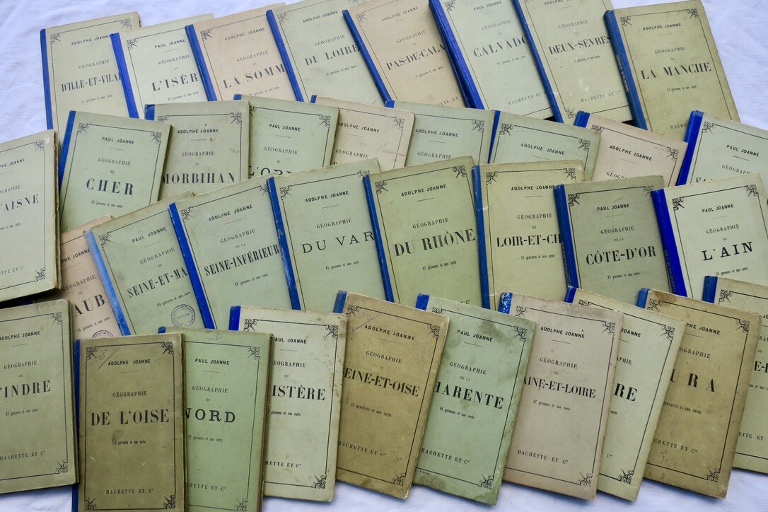 Texte sur deux colonnes pour la partie dictionnaire des communes- par l’auteur du dictionnaire géographique et de l’itinéraire général de la France – dos percaline bleue – plat supérieur imprime (auteur, titre, éditeur) avec motifs d’encadrement