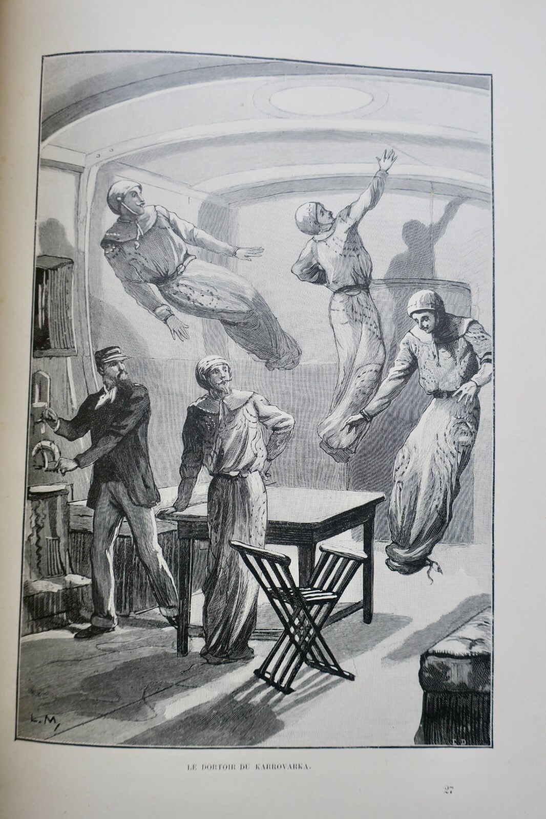 Paris, Ancienne Librairie Furne, Société d’Editions et de Librairie, Voyages Excentriques, 1re édition sans date (1897), 21×31 cm., 440 pages, reliure demi-cuir, tranches dorées, quelques feuillets décalés, coins émoussés.