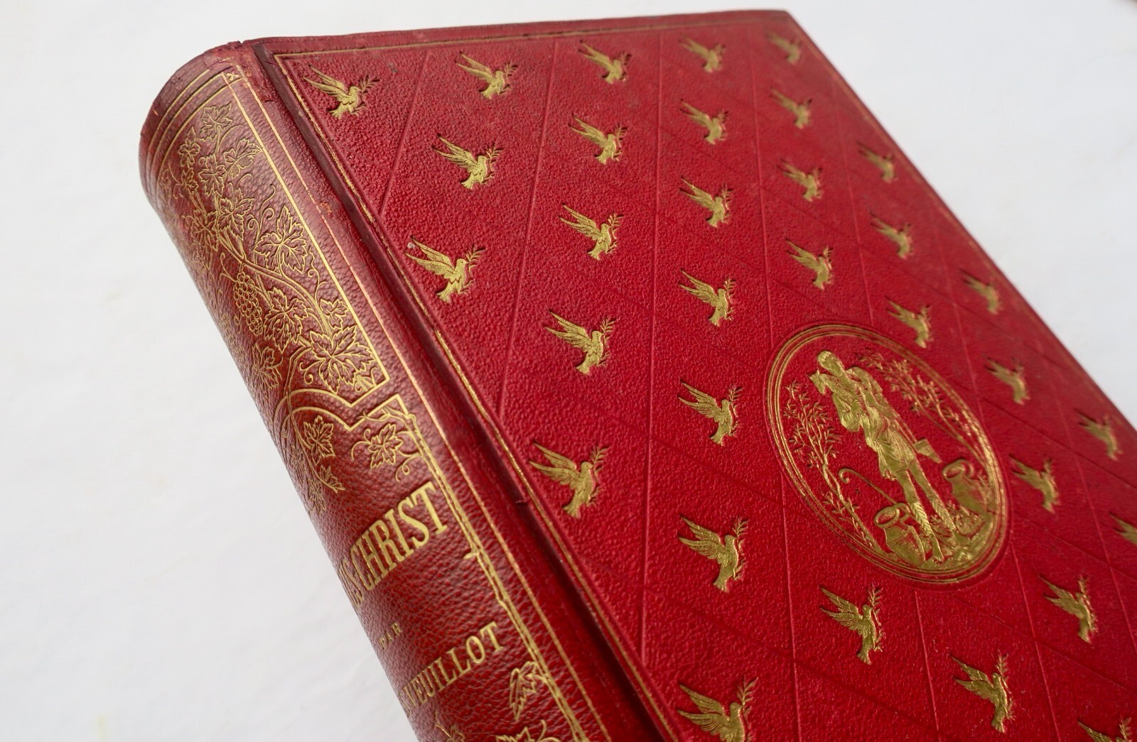 Librairie de Firmin-Didot frères ,fils et Cie, Paris, 1875, 22 x 29 cm., 571 pp., usures en coiffes, en coins et aux mors, belle reliure demi-chagrin, tranches dorées (signées Magnier), 3 feuillets légèrement décalés. Avec une étude sur l’art chretien par E. Cartier. Ouvrage contenant 180 gravures noir et blanc et bistre (dont certaines depliantes en fin d’ouvrage), éxécutées par Huyot pere et fils et 16 chromolithographies en couleur d’après les monuments de l’art depuis les catacombes jusqu’a nos jours