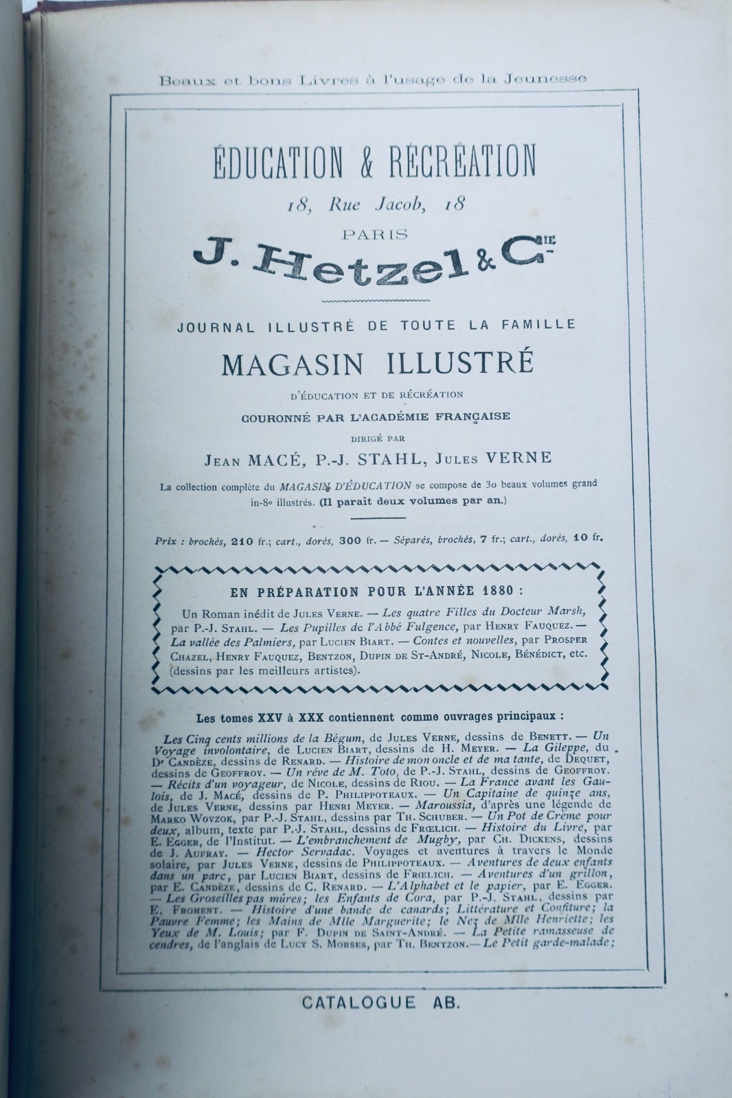 Paris, J. Hetzel et Cie, grand in 8°, reliure percaline aux initiales, tranches dorées (bien réglées), 185 pp., catalogue AB in fine, dessins de N. Benett, usures en coins et en coiffes, une fissure de 6 cm, sur un mors, une coupure sans manque en marge d’un feuillet, quelques rares et pâles rousseurs.
