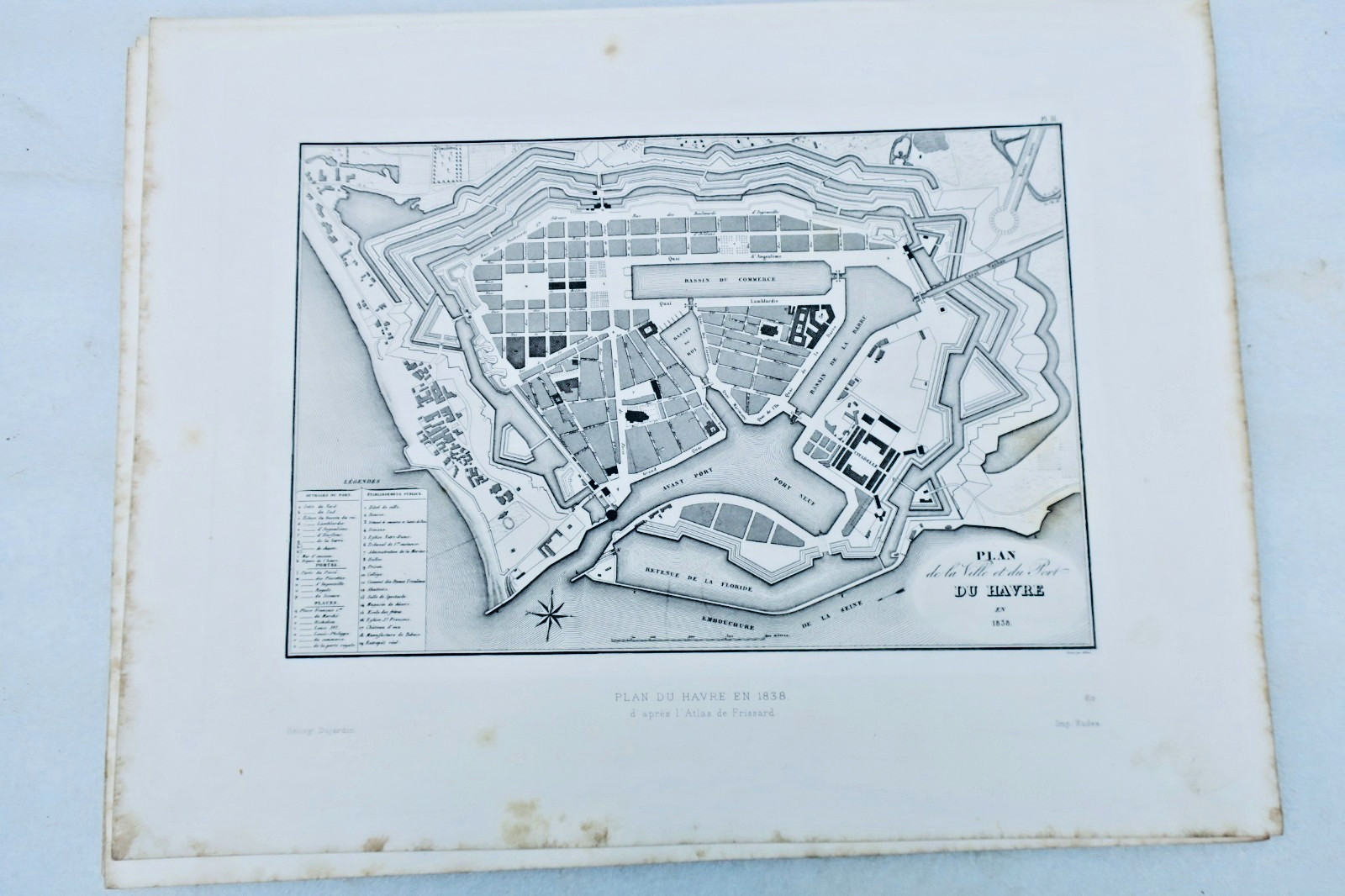EAUX-FORTES de Toussaint, Lancelot, Léopold, Sadoux, Greux publiées dans la description du Havre, vers 1883, 27 x 35 cm., sur papier fort dont un plan du Havre en 1838 d’après l’Atlas de Frissard