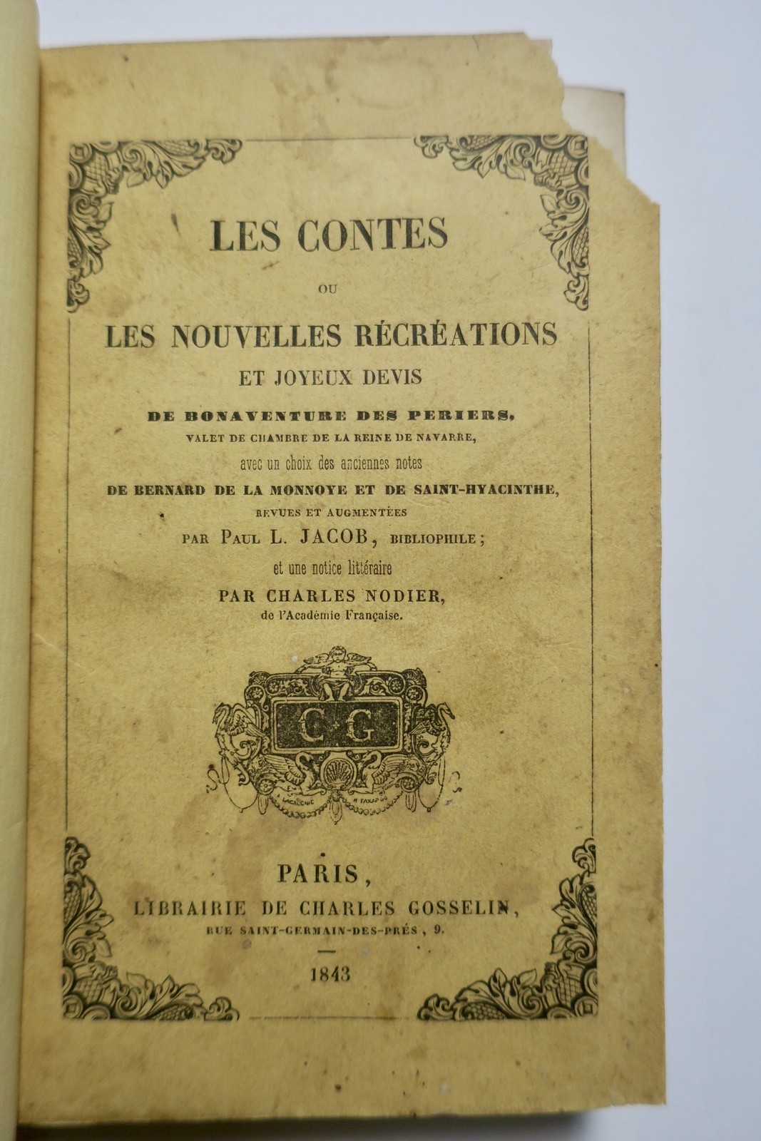 Les contes ou les nouvelles recréations et joyeux devis de Bonaventure des Periers, valet de chambre de la Reine de Navarre avec un choix des anciennes notes de Bernard de la Monnoye et de Saint-Hyacinthe revues et augmentées par Paul L. Jacob, bibliophile et une notice littéraire de Charles Nodier