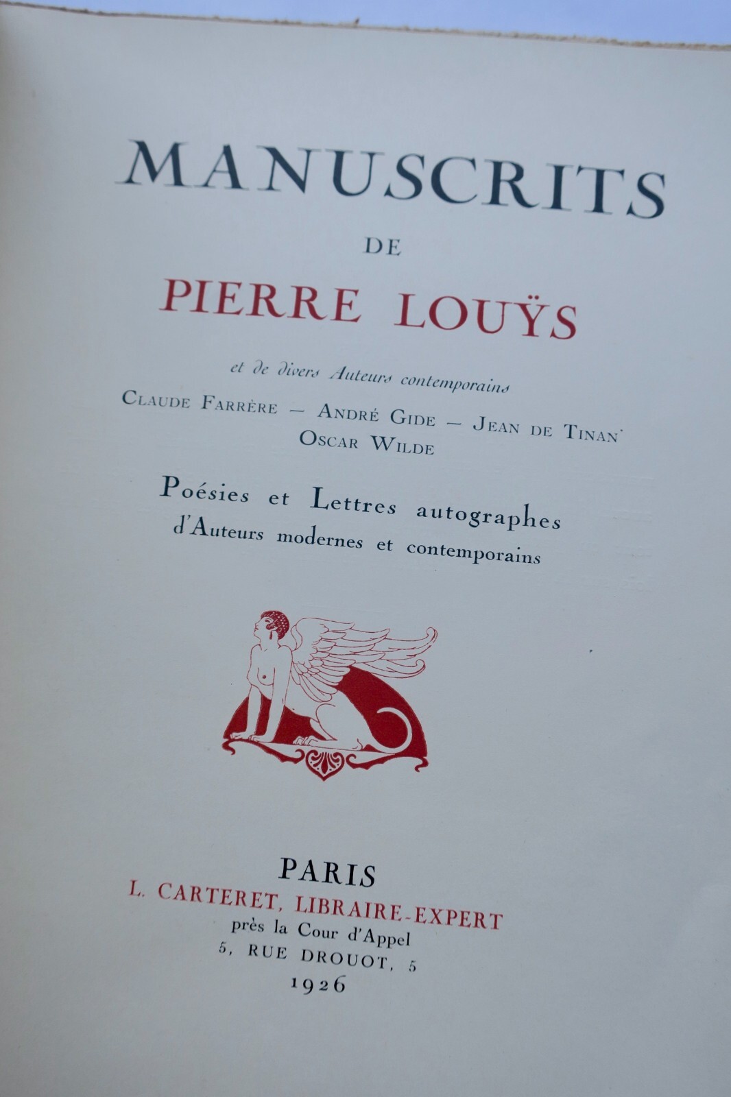 Manuscrits de Pierre Lou s et de divers auteurs contemporains : Claude Farrère – André Gide – Jean de Tinan – Oscar Wilde – Poésies et lettres autographes d’auteurs modernes et contemporains