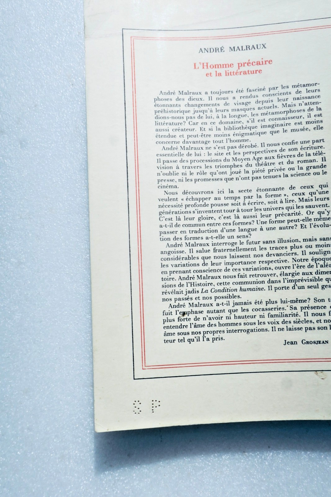 Malraux (André) L’Homme précaire et la Littérature SP