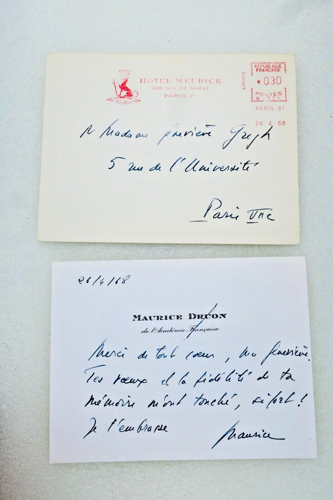 Carte de Maurice Druon signée à son ex-femme, Geneviève Gregh de l’hôtel Meurice