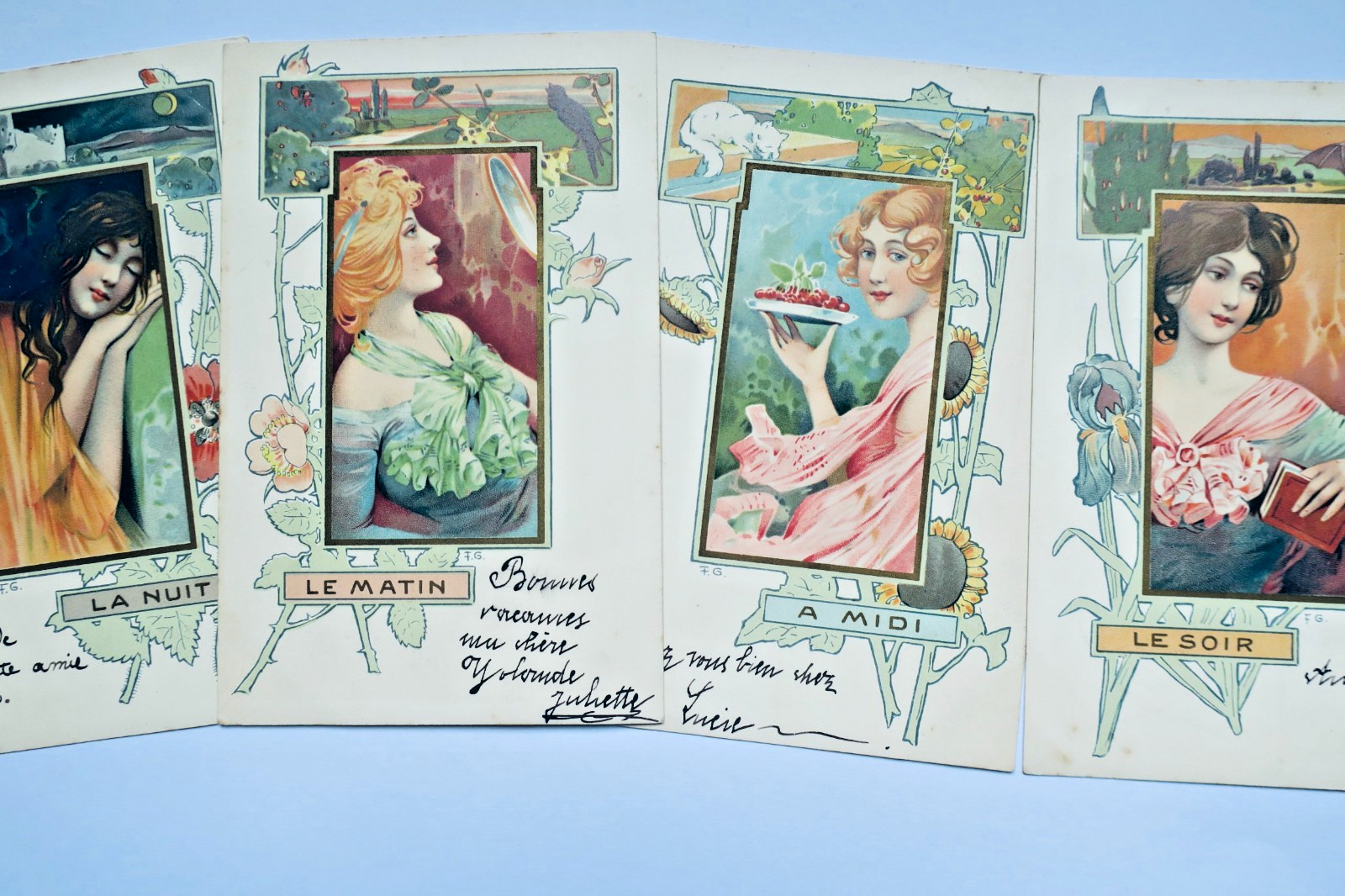 art nouveau jeune femme illustré par F. G. matin, midi, soir, nuit 1902