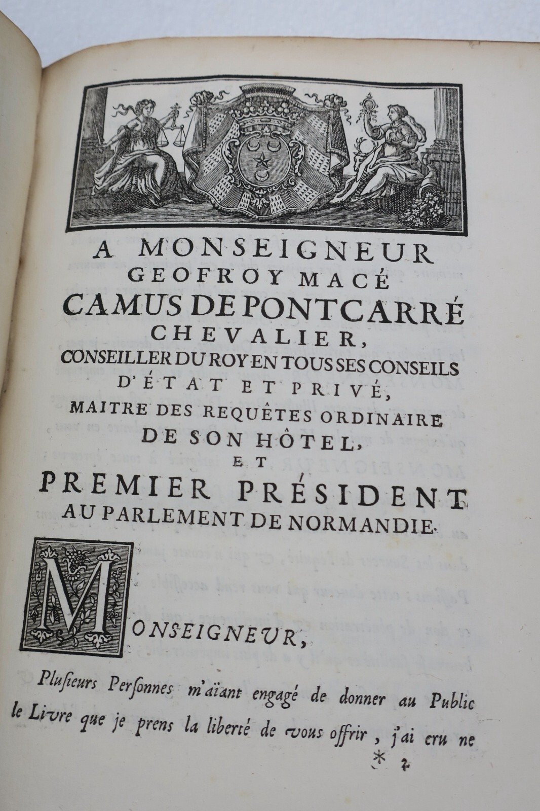 Rouen, Pierre Le Boucher, 1742, in-4° de 4°, XV & 632 pp., belle reliure plein veau, tranches brique, mors partiellement fissurés, manques en coiffes, coins choqués ou émoussés, quelques rousseurs.