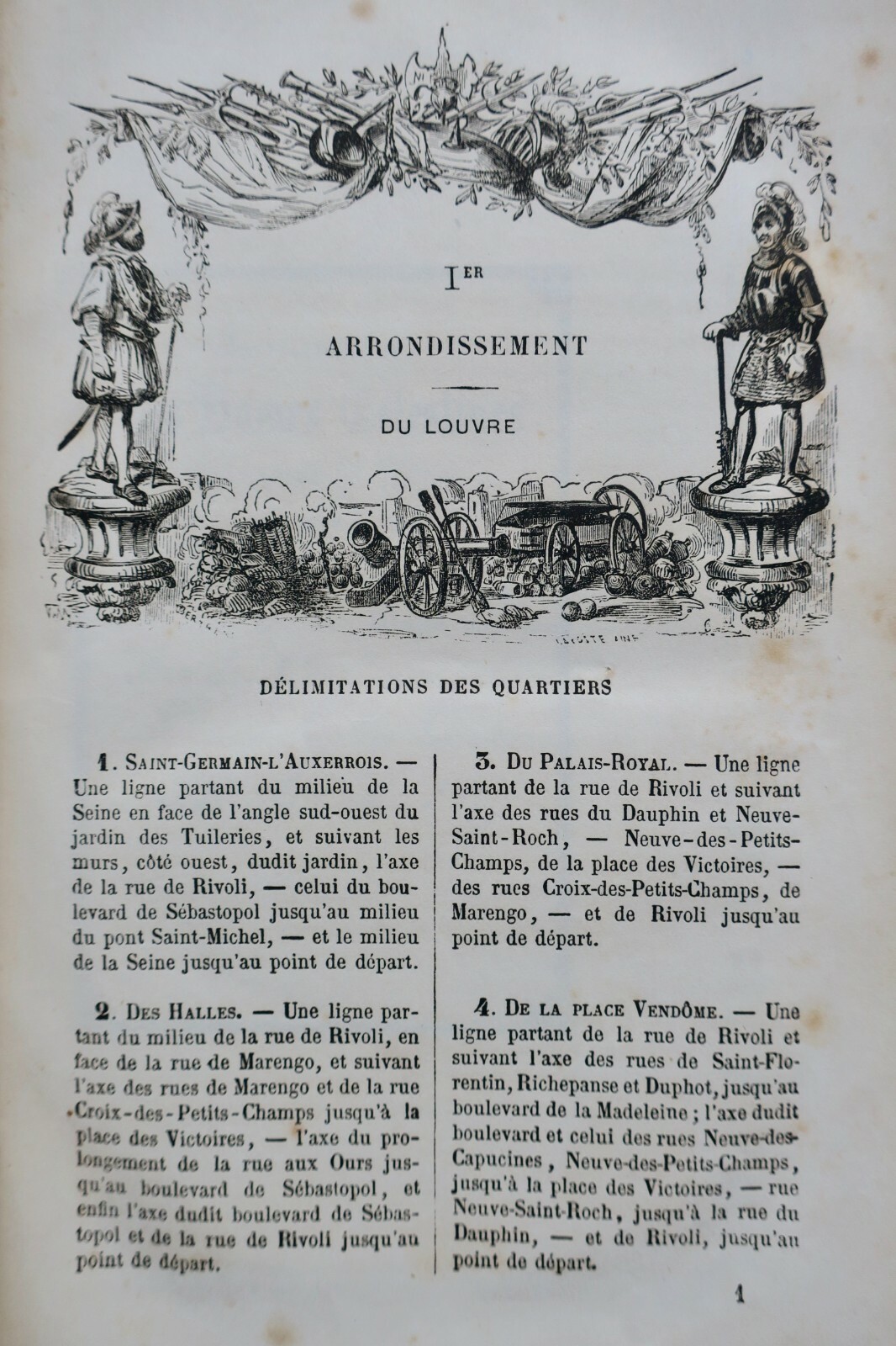 Paris – Album Historique et Monumental divisé en Vingt Arrondissements. Illustré de 250 gravures sur bois par Diolot. Reliure percaline marron (en l’état, plat supérieur manquant, coins émoussés) intérieur bien conservé.