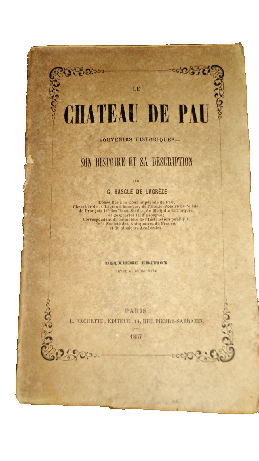Bascle de Lagreze, G. Le chateau de Pau – Souvenirs historiques – son histoire et sa description – Deuxieme edition Paris Hachette 1857VIII & 412 pp, broché, dos fendu, illustré en frontispice, intérieur bel état, couverture en l’état(mériterait une belle reliure), non coupé, non rogné –