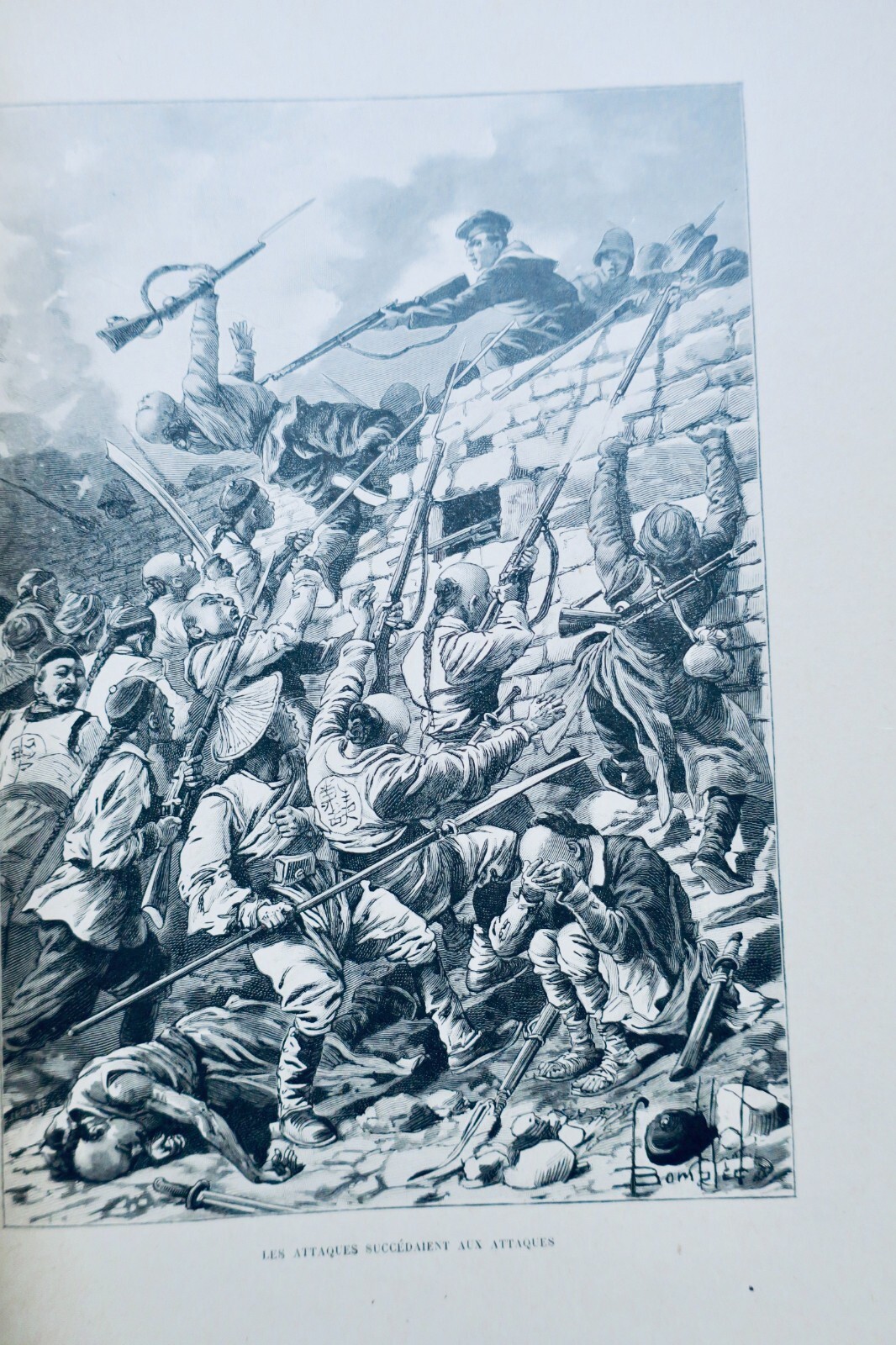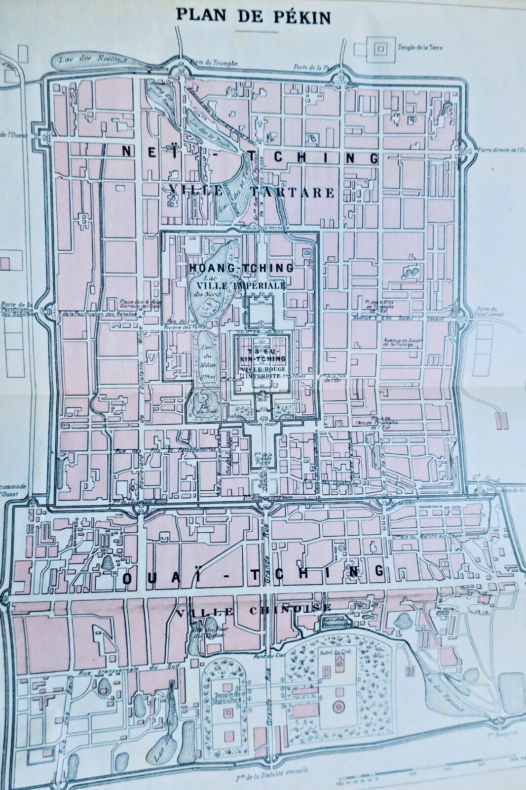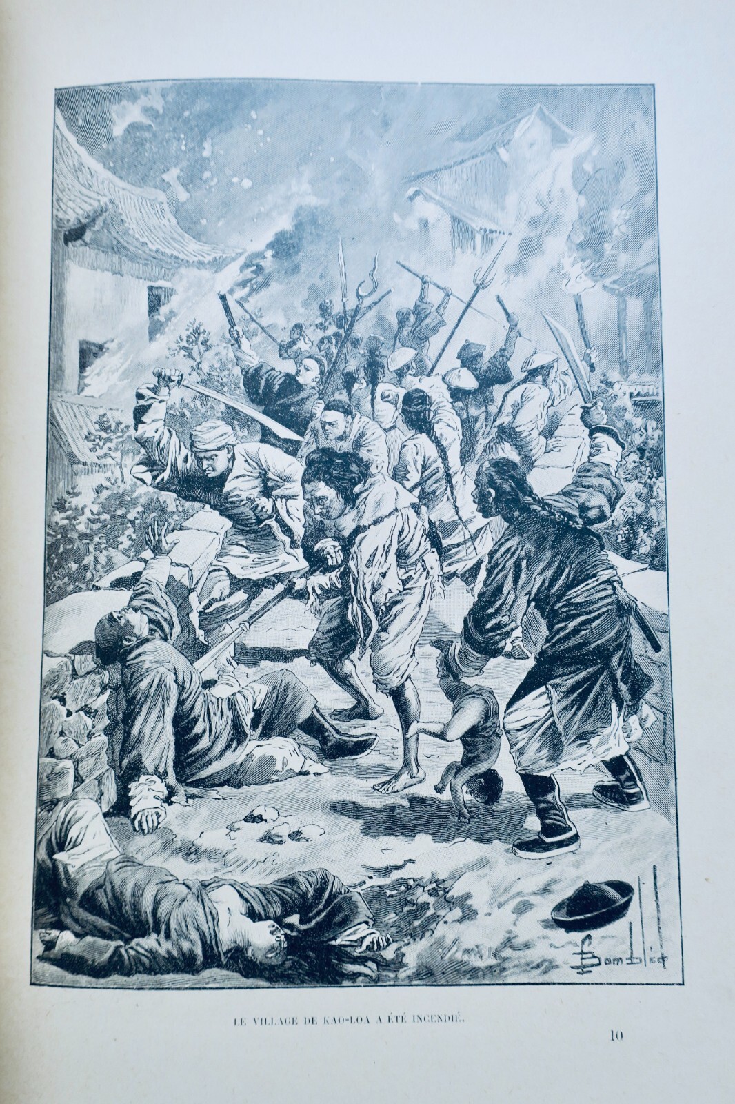 Paris, Acienne librairie Furne, Combet et Cie, sans date (1901), « Les voyages excentriques », in 4°, 23 x 31 cm., 462 pp., bien complet du plan dépliant de la ville de Pékin au début de l’ouvrage, joli cartonnage de l’éditeur de pleine percaline rouge signé J. FAU et relié par Nerson, aux bords biseautés, 1er plat orné d’une belle composition polychrome d’après Bombled, coins émoussés, usures en coiffes, tranches dorées, cahiers lâches, une charnière (intérieur) fissurée, intérieur bien conservé cependant.
