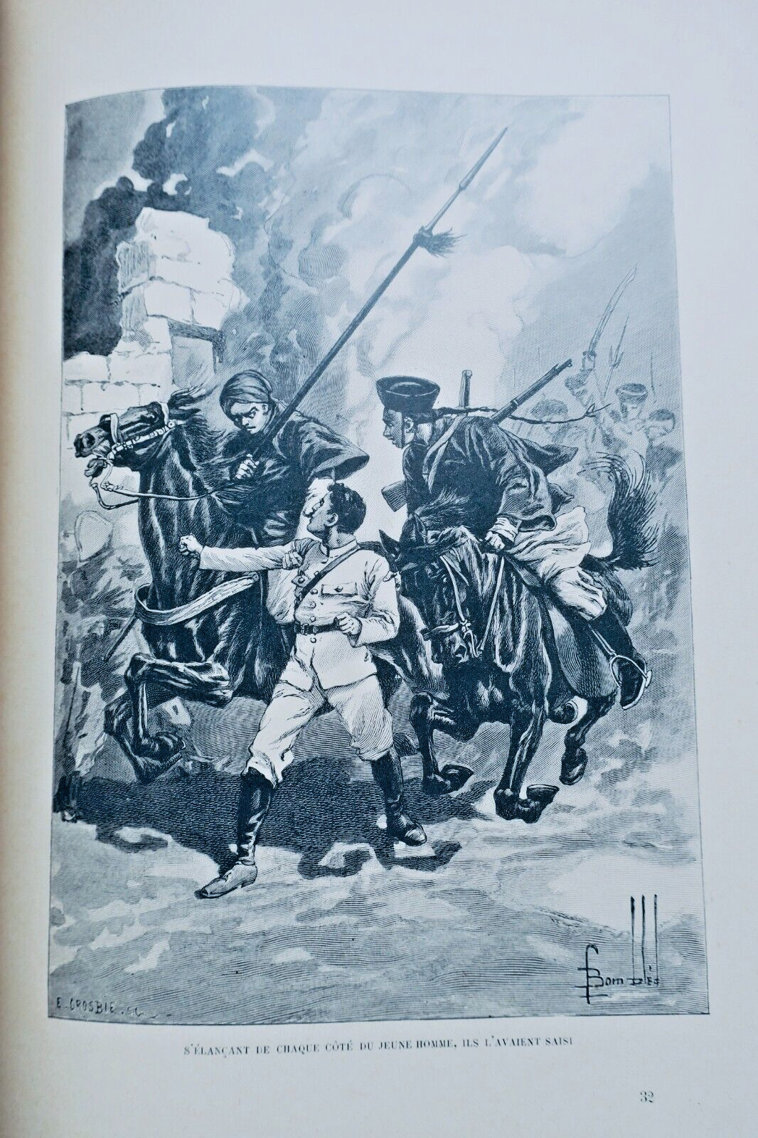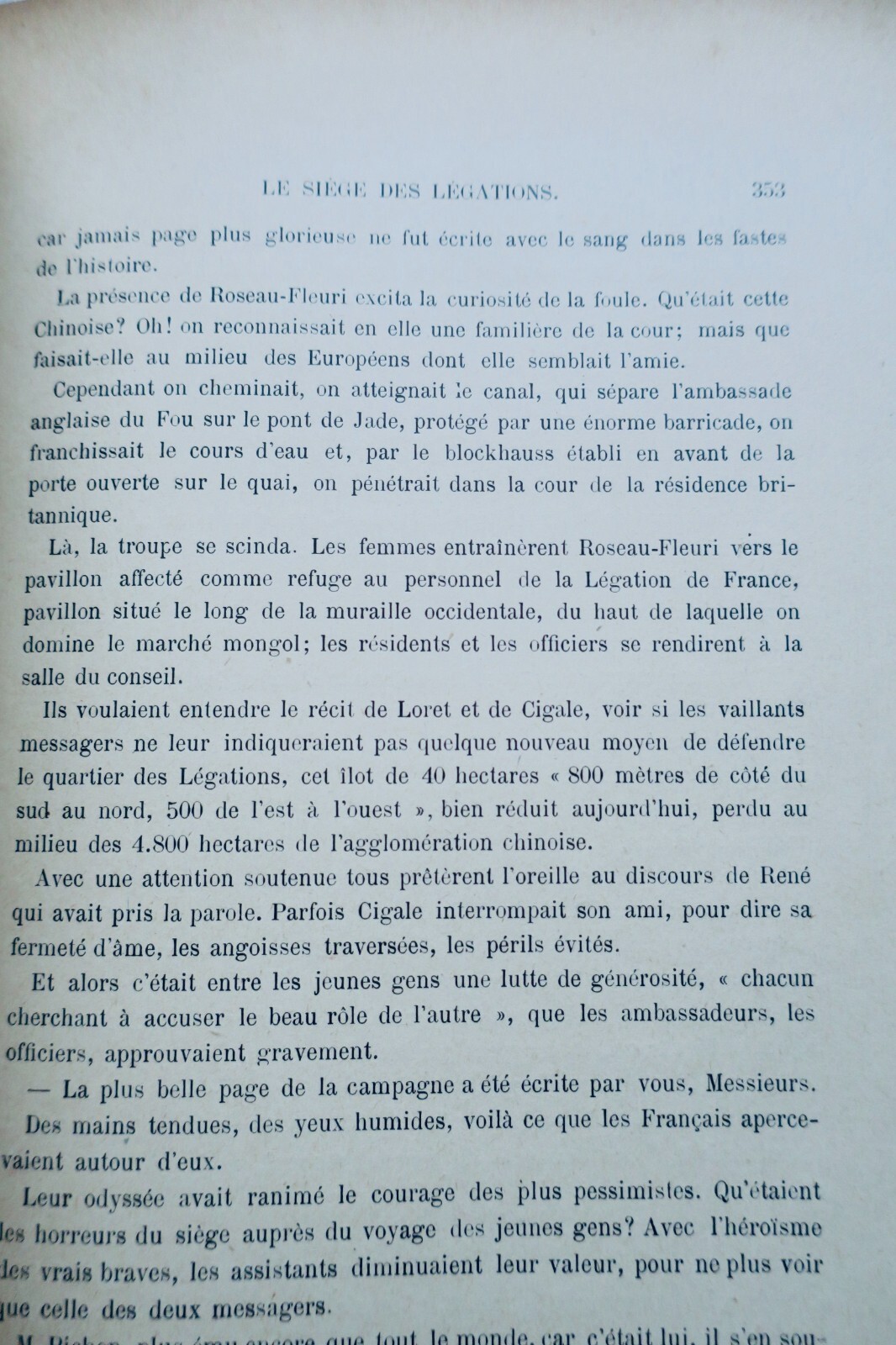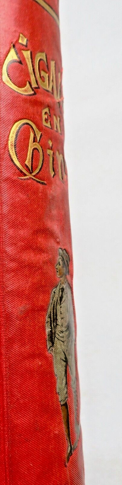 Paris, Acienne librairie Furne, Combet et Cie, sans date (1901), « Les voyages excentriques », in 4°, 23 x 31 cm., 462 pp., bien complet du plan dépliant de la ville de Pékin au début de l’ouvrage, joli cartonnage de l’éditeur de pleine percaline rouge signé J. FAU et relié par Nerson, aux bords biseautés, 1er plat orné d’une belle composition polychrome d’après Bombled, coins émoussés, usures en coiffes, tranches dorées, cahiers lâches, une charnière (intérieur) fissurée, intérieur bien conservé cependant.