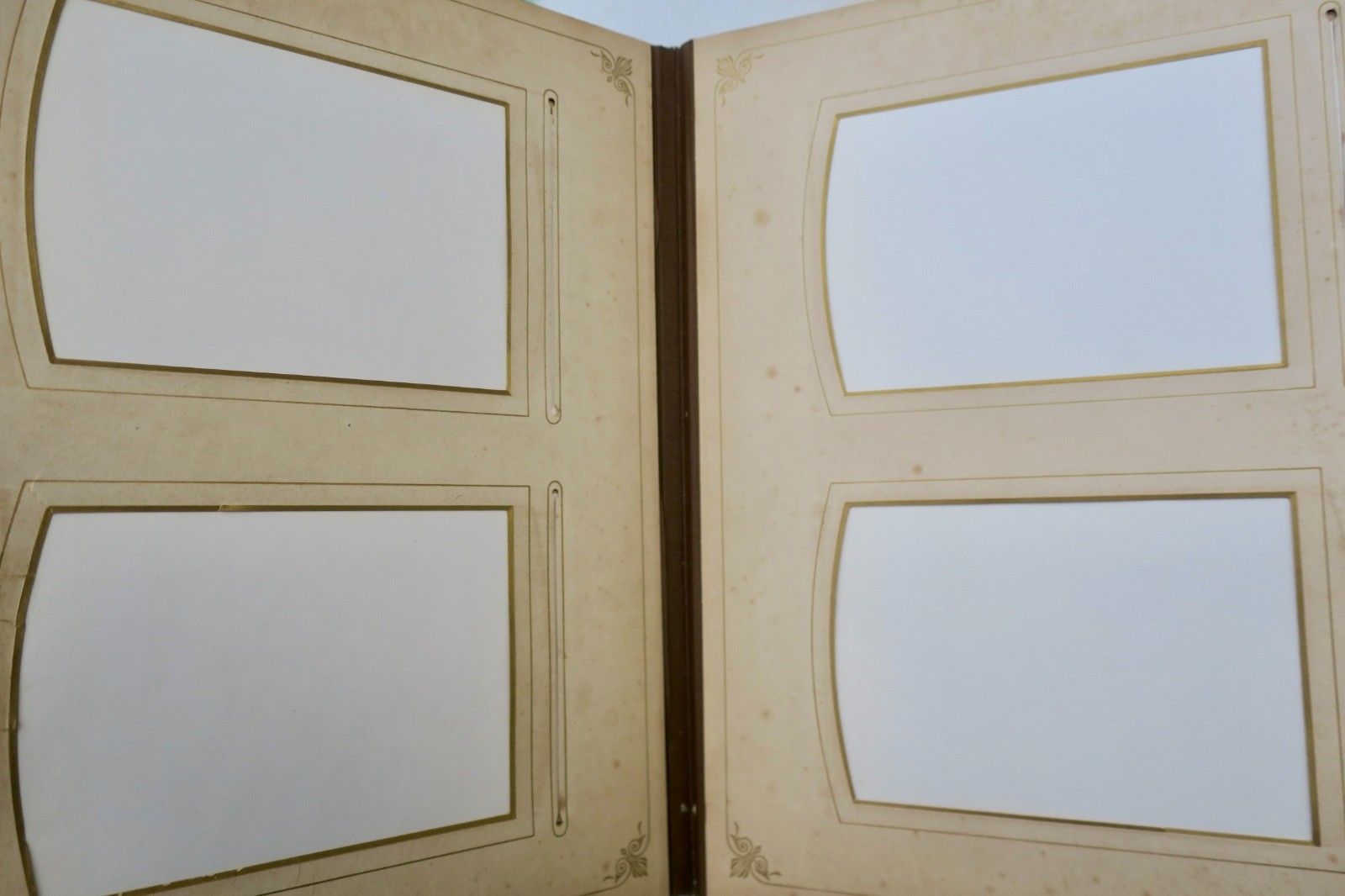 Belle album photo garni de velours bordeaux, d’écoinçons argent, tranches dorées, 32 pages, 28 x 33 x 7 cm., petites usures en coiffes & en coins du dernier plat.