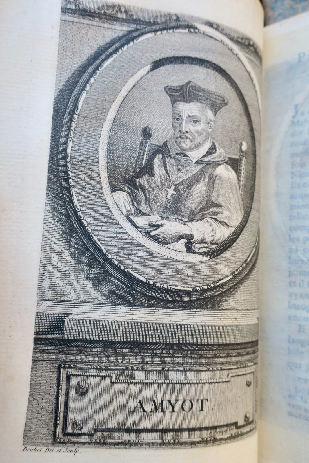 T.1 à 7 : Vies des Hommes illustres, Grecs et Romains, comparées l’une avec l’autre par Plutarque de Chaeronée. T.8 à 11 : Oeuvres Morales. T.12 à 14 : Oeuvres Meslées. T.15 : Tables. T.16 à 18 : Vies des Hommes Illustres pour servir de Supplément aux Oeuvres de Plutarque. Un portrait de Plutarque et un portrait d’Amyot par Brichet.