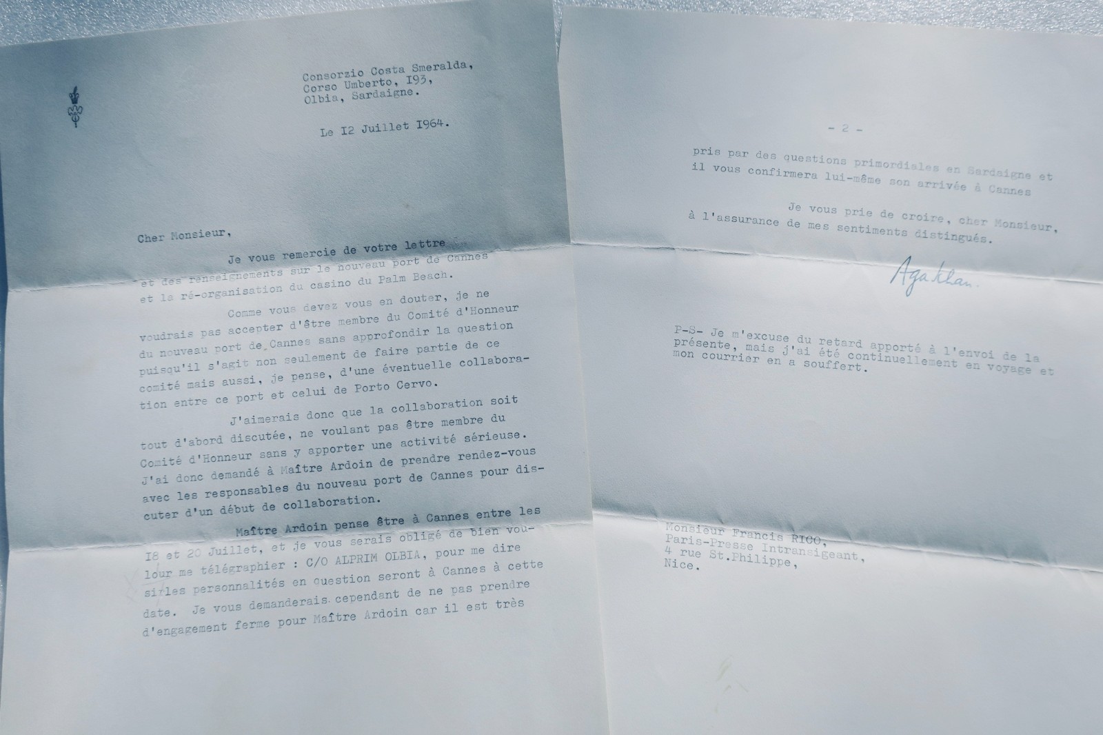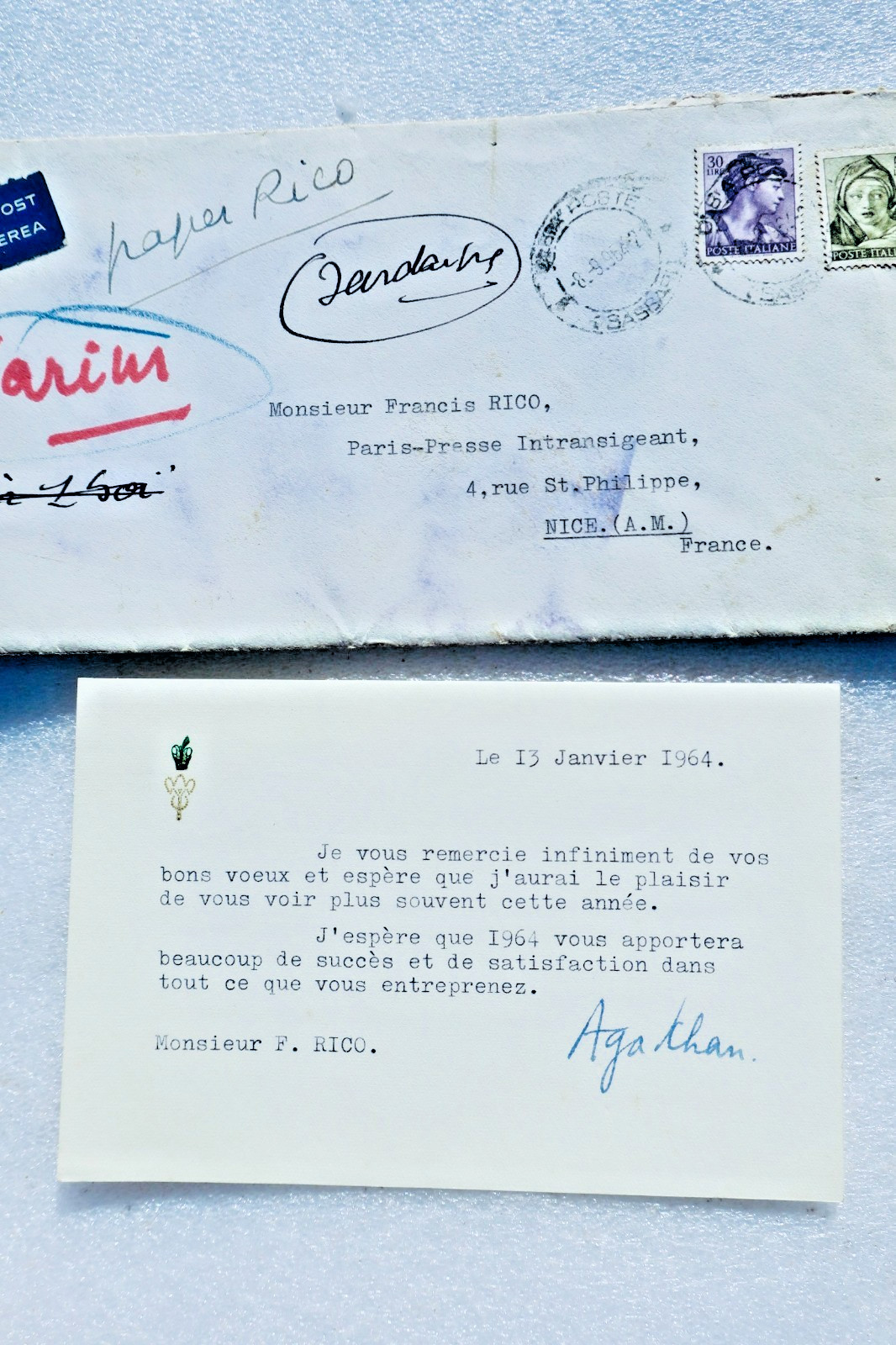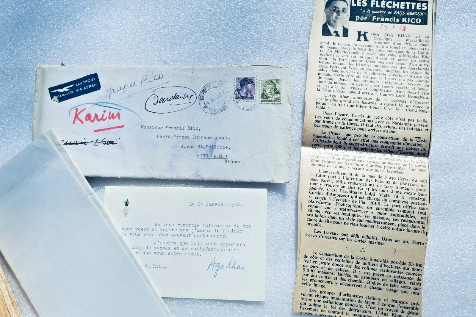 Nous joignons une lettre & une carte de voeux tapuscrites sous enveloppe signées de la main de l’Aga Khan à Francis Rico au sujet de la création du site de Porto Cervo, ainsi qu’une coupure de presse de Francis Rico également au sujet de Porto Cervo