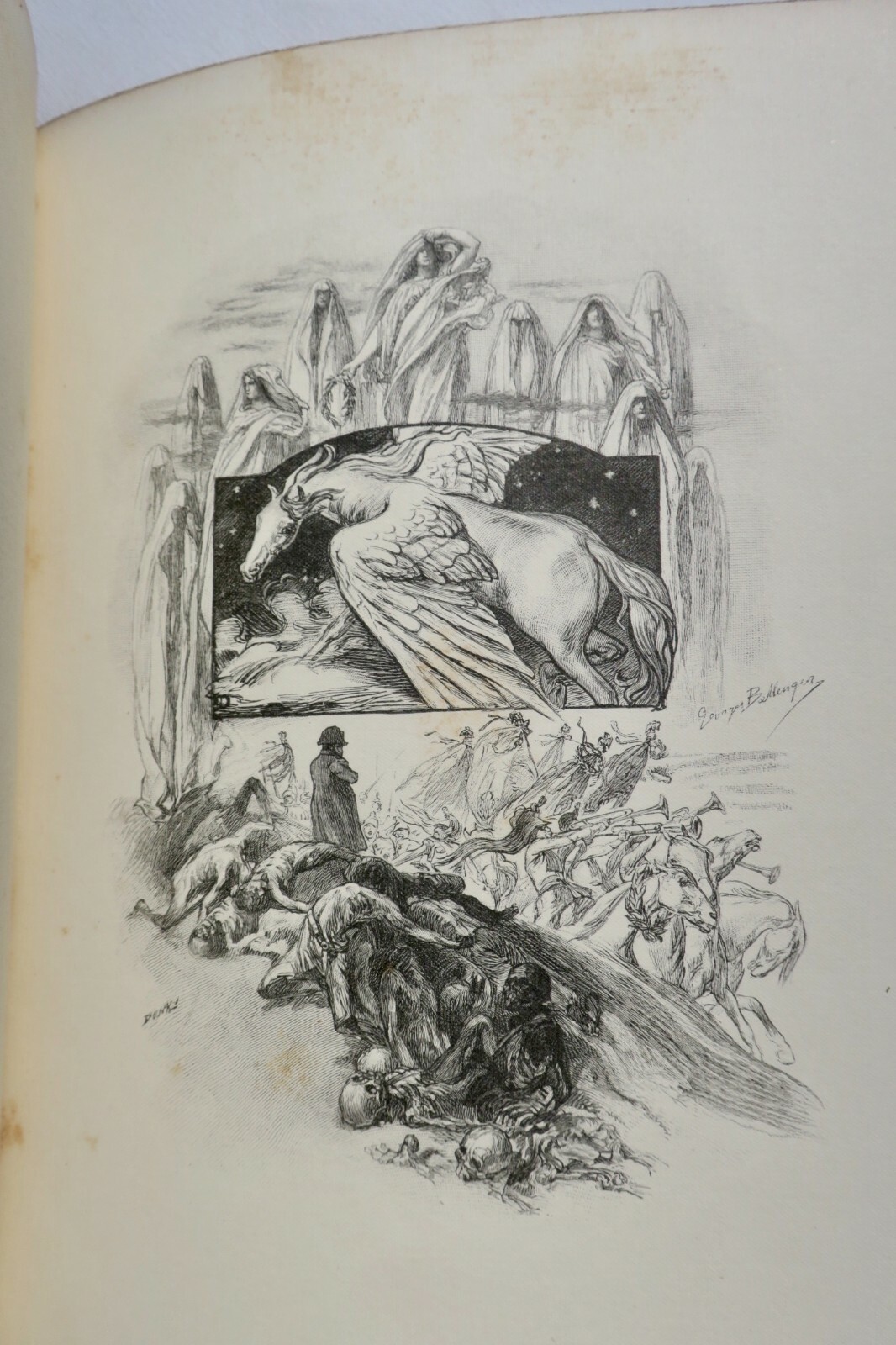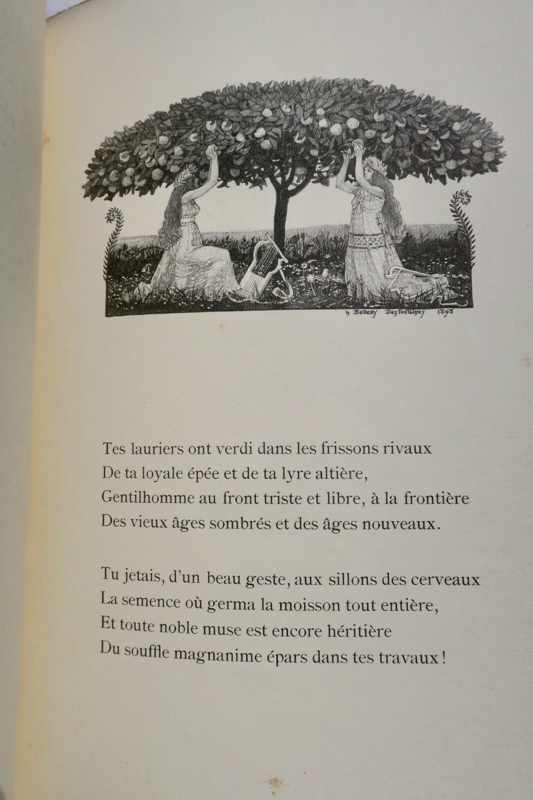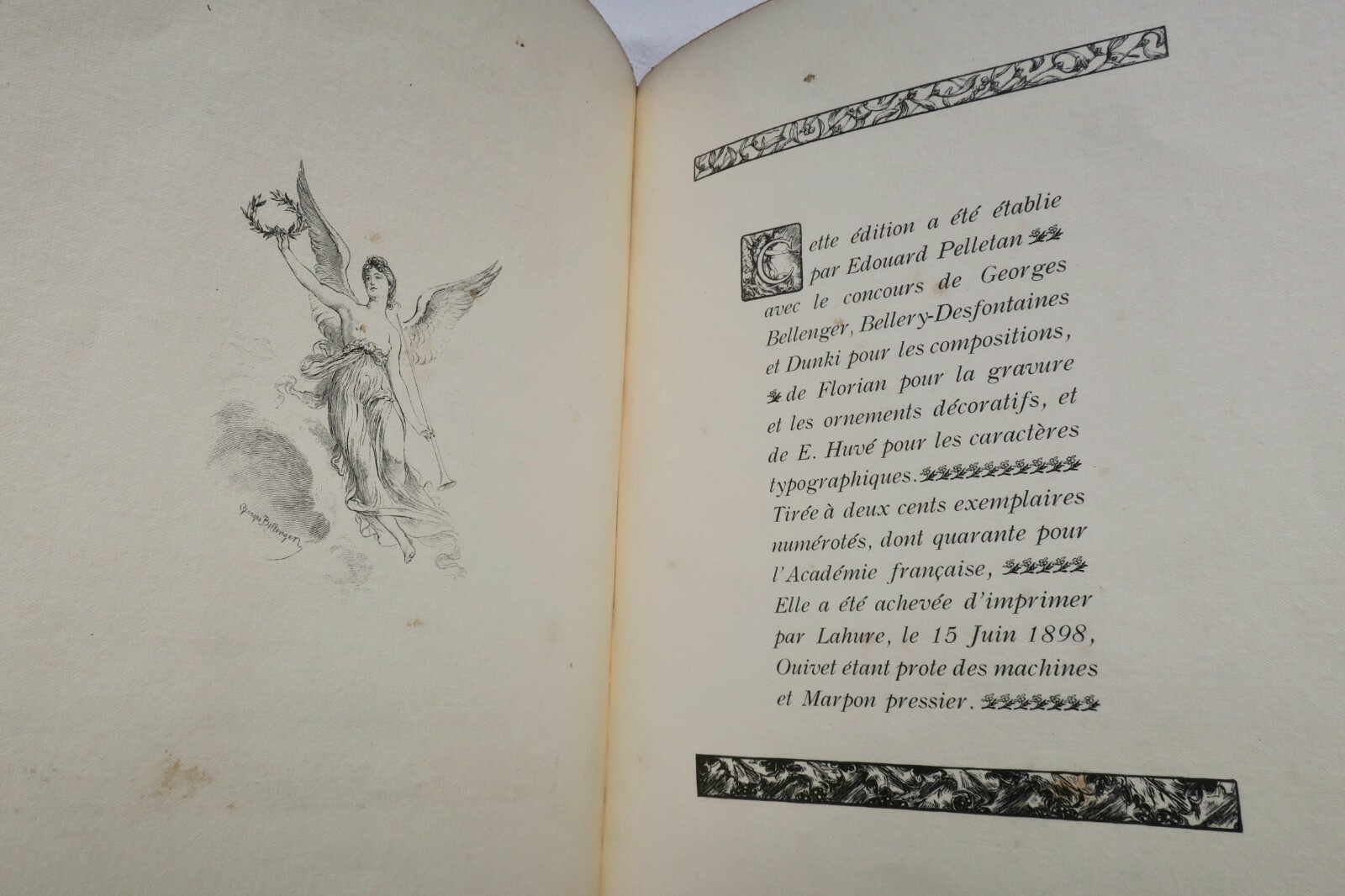 Paris, Édouard Pelletan, 1898. In-4°, belle reliure demi-maroquin à coins, tête dorée, couv. cons, quelques rousseurs en pages de garde. Edition établie par Edouard Pellatan avec le concours de Georges Bellenger, Bellery-Desfontaines et Dunki pour les compositions et de Florian pour la gravure et les ornements décoratifs, et de E. Huvé pour les caractères typographiques. Tirage à deux cents exemplaires [sur vélin du Marais], dont quarante pour l’Académie française.