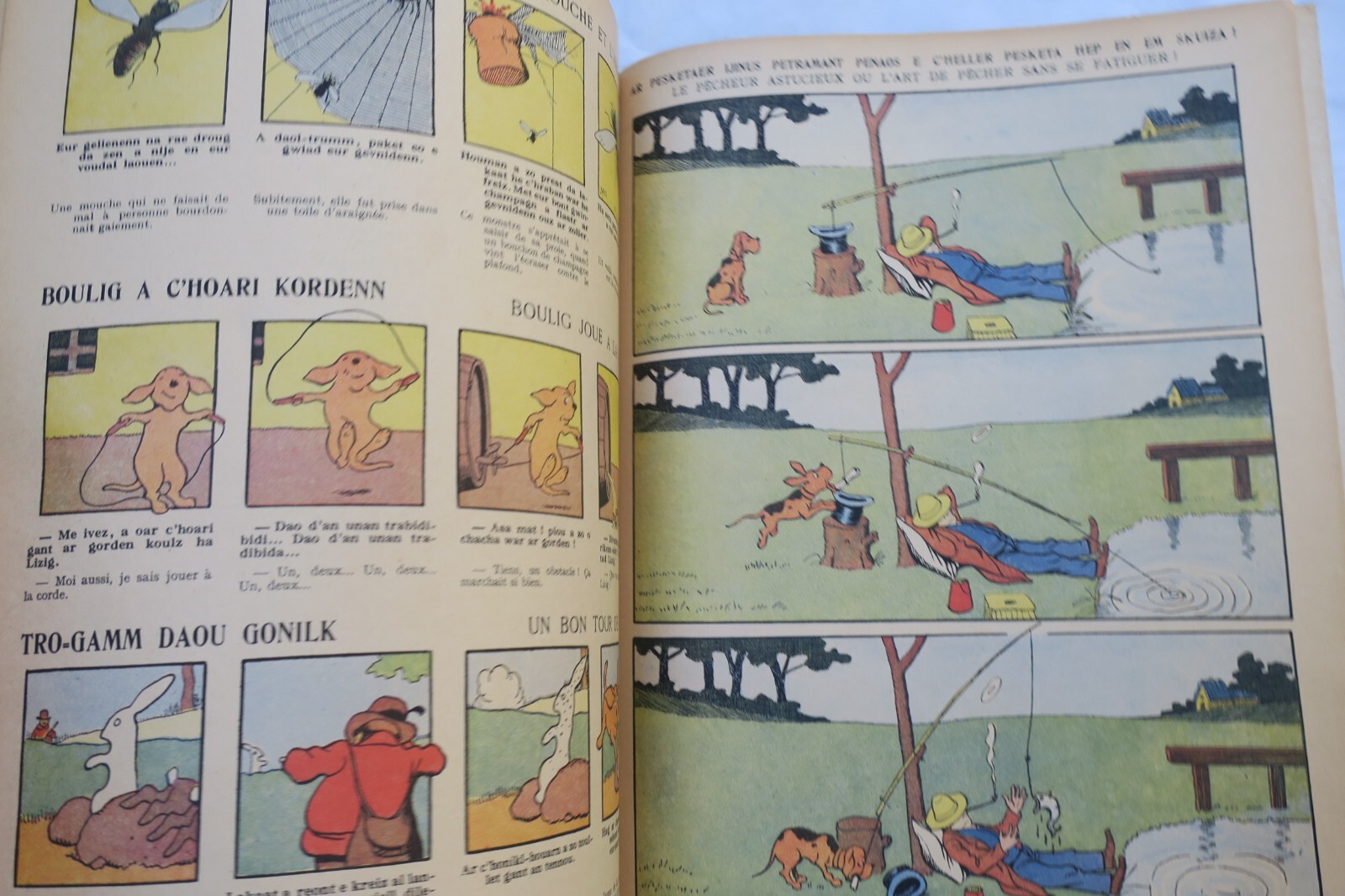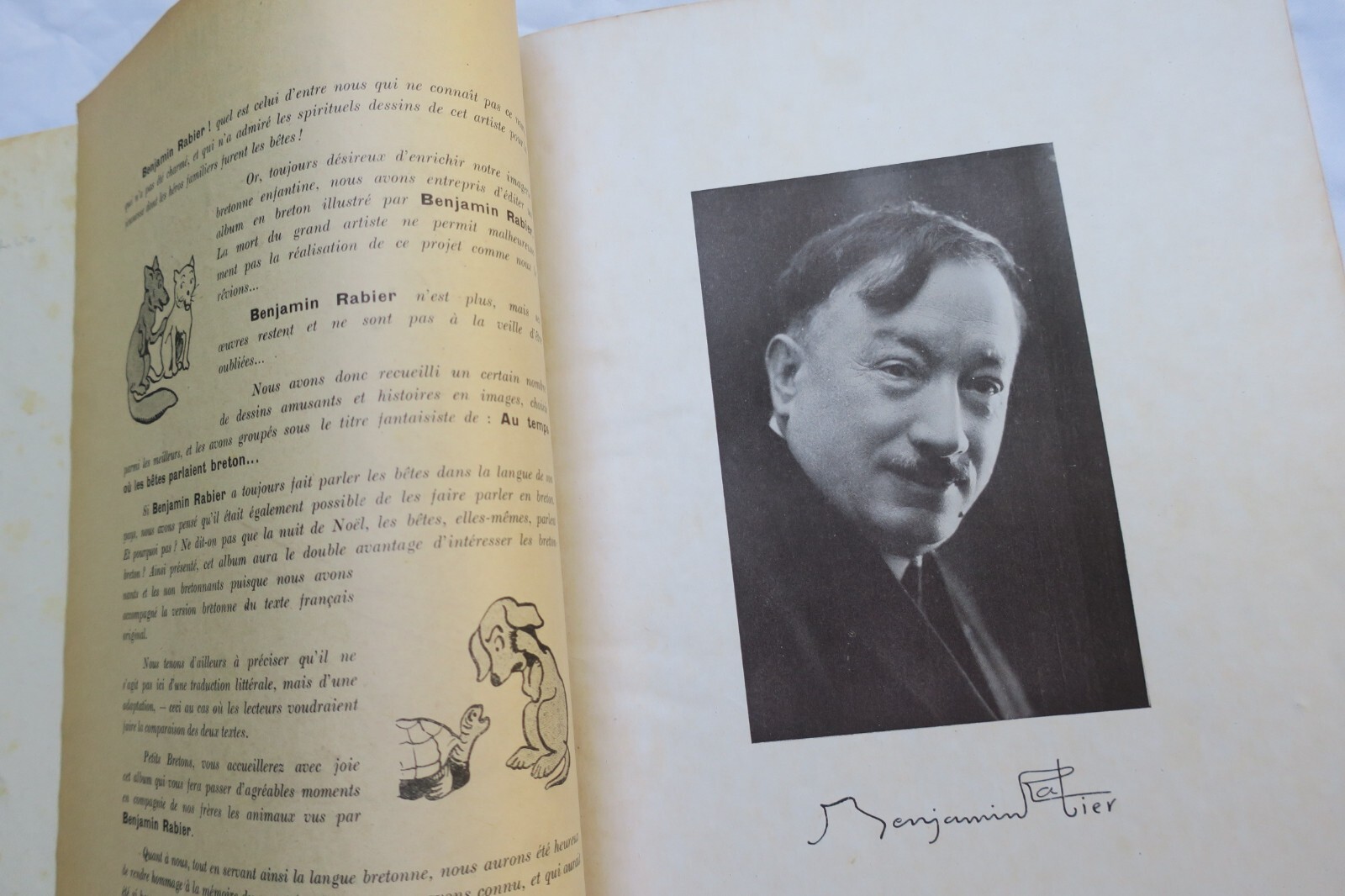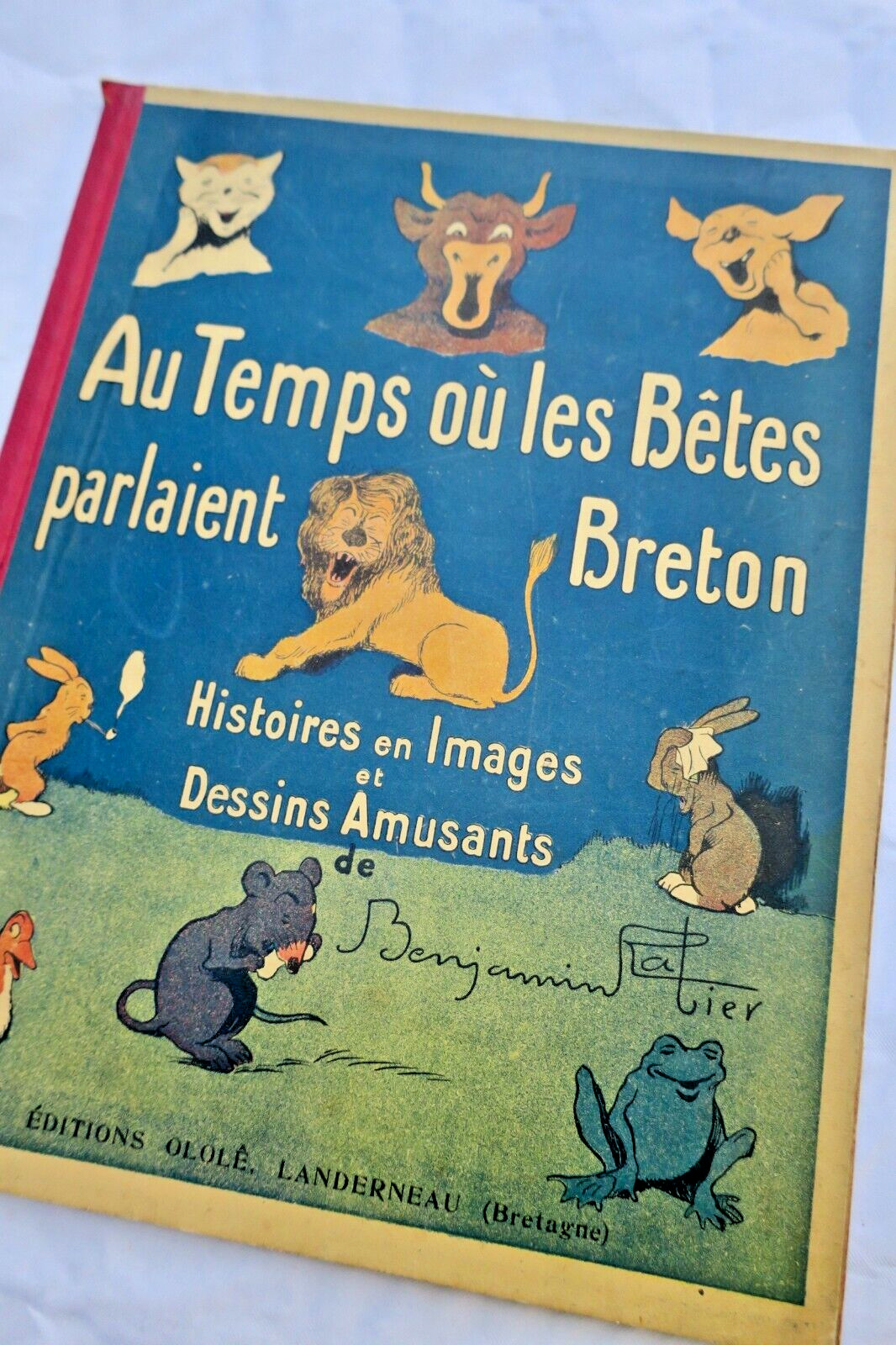 Rabier BenjaminAu temps où les bêtes parlaient breton. Histoires en images et dessins amusantsLanderneau Editions Ololé-Urz Goanag Breiz, In-4°, album cartonné, sans date, 64 pages, texte en français et en breton, illustrations en noir et en couleurs de Benjamin Rabier, petites usures en coins et en coiffes.Agréable exemplaire
