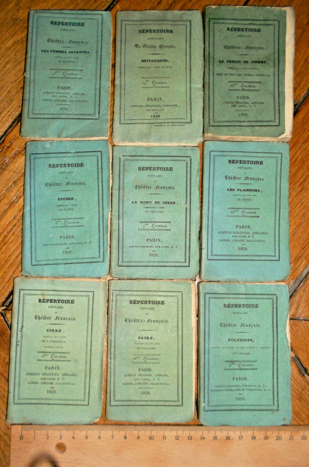 la mort de Cesar, 40 pp., Voltaire polyeucte, 71 pages Zaire, Voltaire, 71 pp. Cinna, Corneille, 64 pp., Les plaideurs, Racine, 64 pp., Esther, racine, 56 pp., le festin de pierre, Corneille, 112 pp., Britanicus, 70 pp., Les femmes savantes, Moliere, 80 pp.