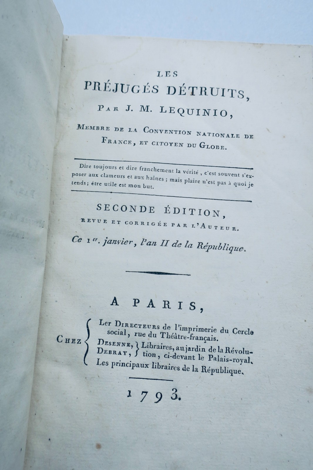Les Préjugés détruits. (Dire toujours et dire franchement la vérité, c’est souvent s’exposer aux clameurs et aux haines ; mais plaire n’est pas à quoi je tends ; être utile est mon but) Le 1er janvier de l’an II de la république