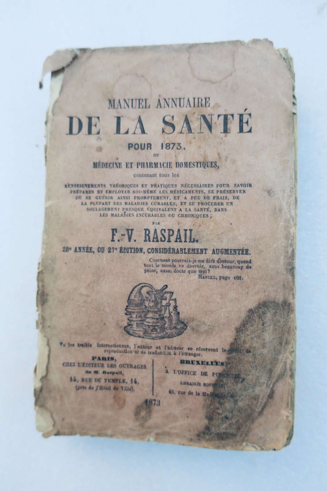 Chez l’éditeur des ouvrages de M. Raspail/ A l’office de publicité. 1873. In-12. Broché, couverture abimée. XII & 428 pp. + catalogue., intérieur bien conservé