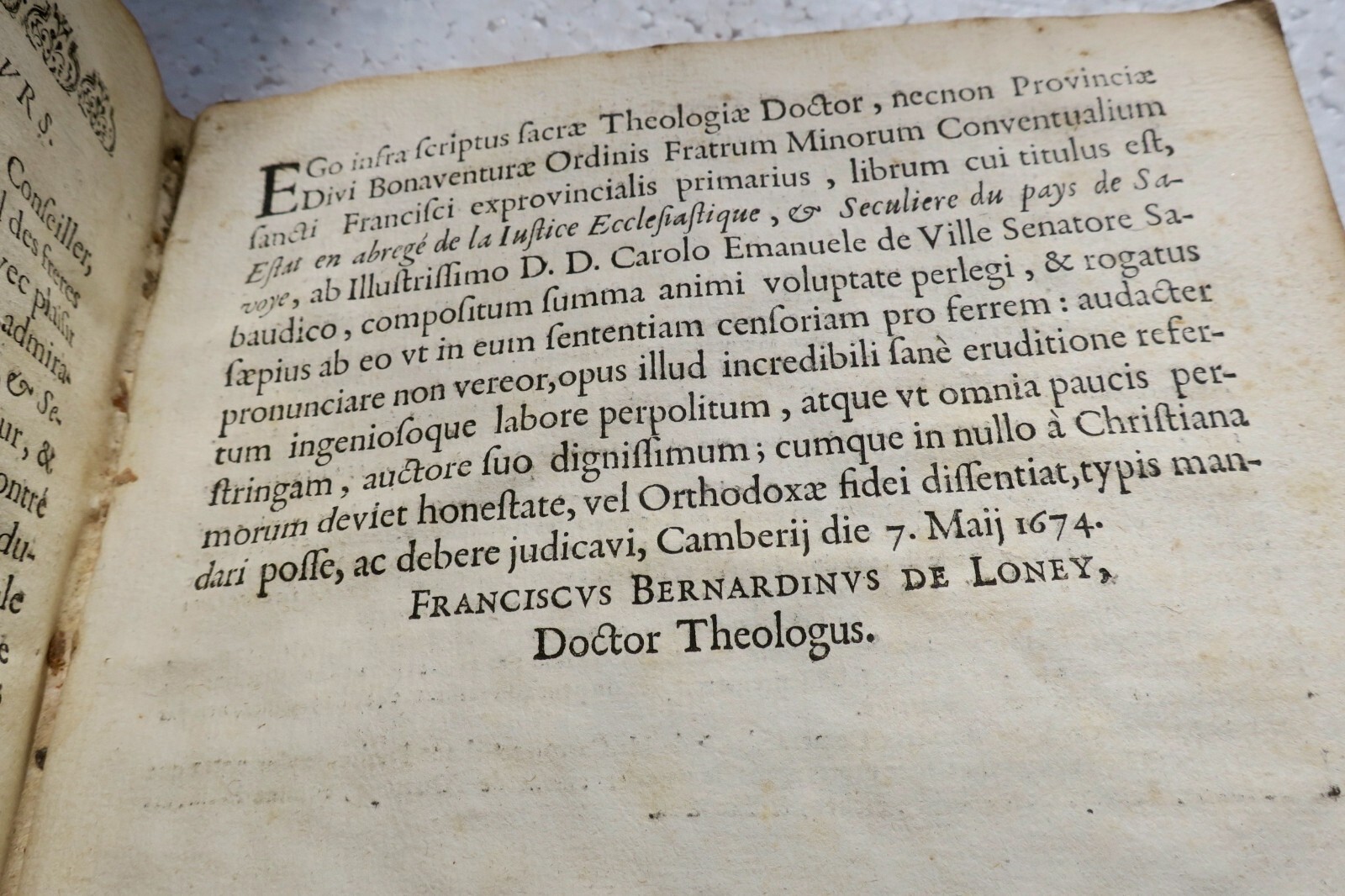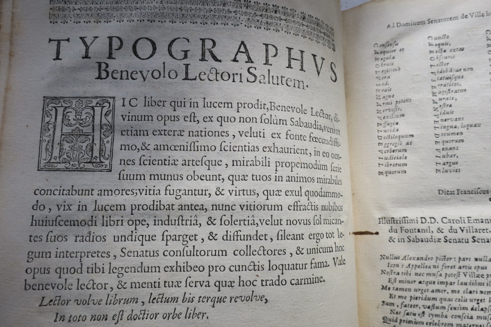 Chambéry, Louis Du Four, 1674. 2 partie reliées en un volume, petit in-4°,  12 ff., 368 & 255 pp. & 2 ff., belle reliure plein veau de l’époque, manques en coiffes, coins émoussés, importantes épidermures au bords d’un plats, petites coupures en haut de 4 feuillets, intérieur bien conservé par ailleurs.